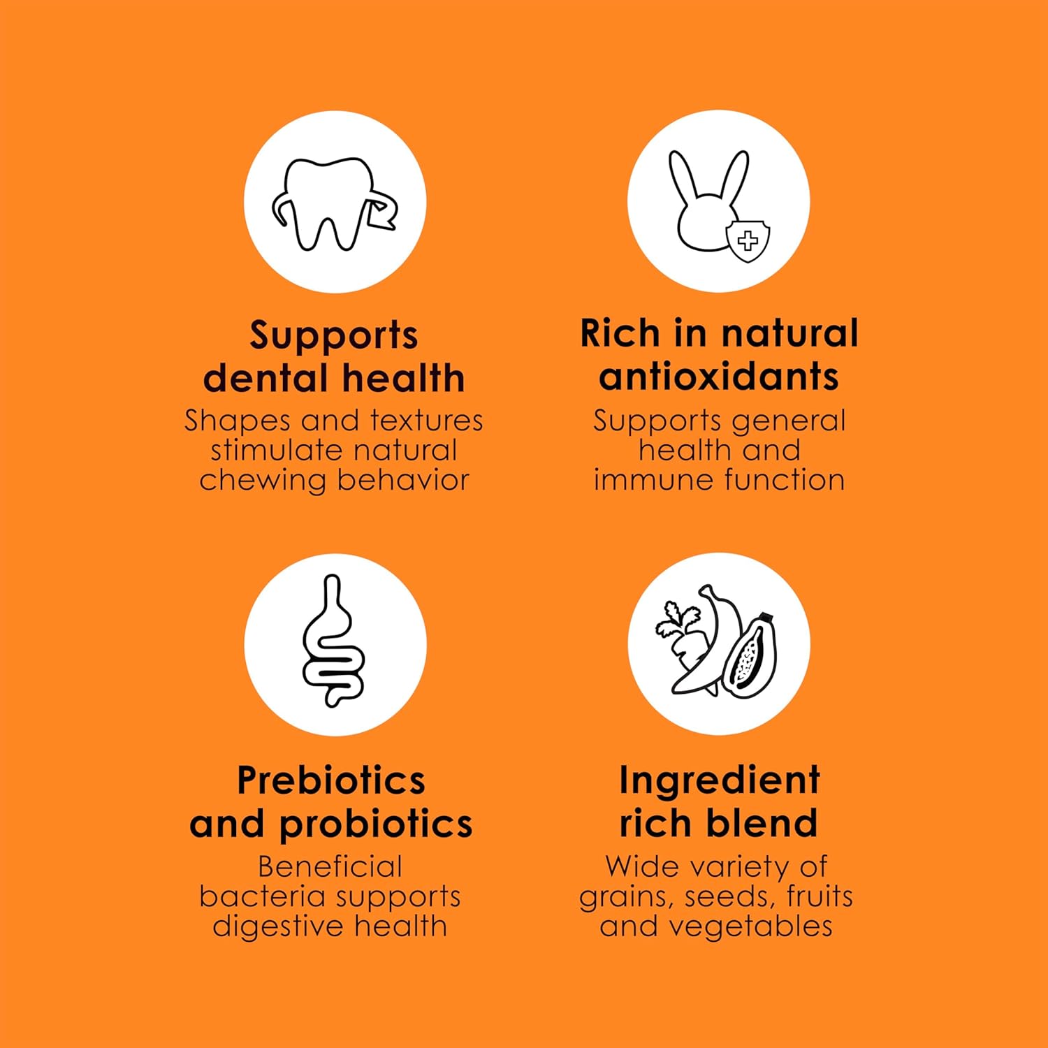 • SUPPORTS DENTAL HEALTH with a variety of shapes and textures, encouraging chewing activity.
