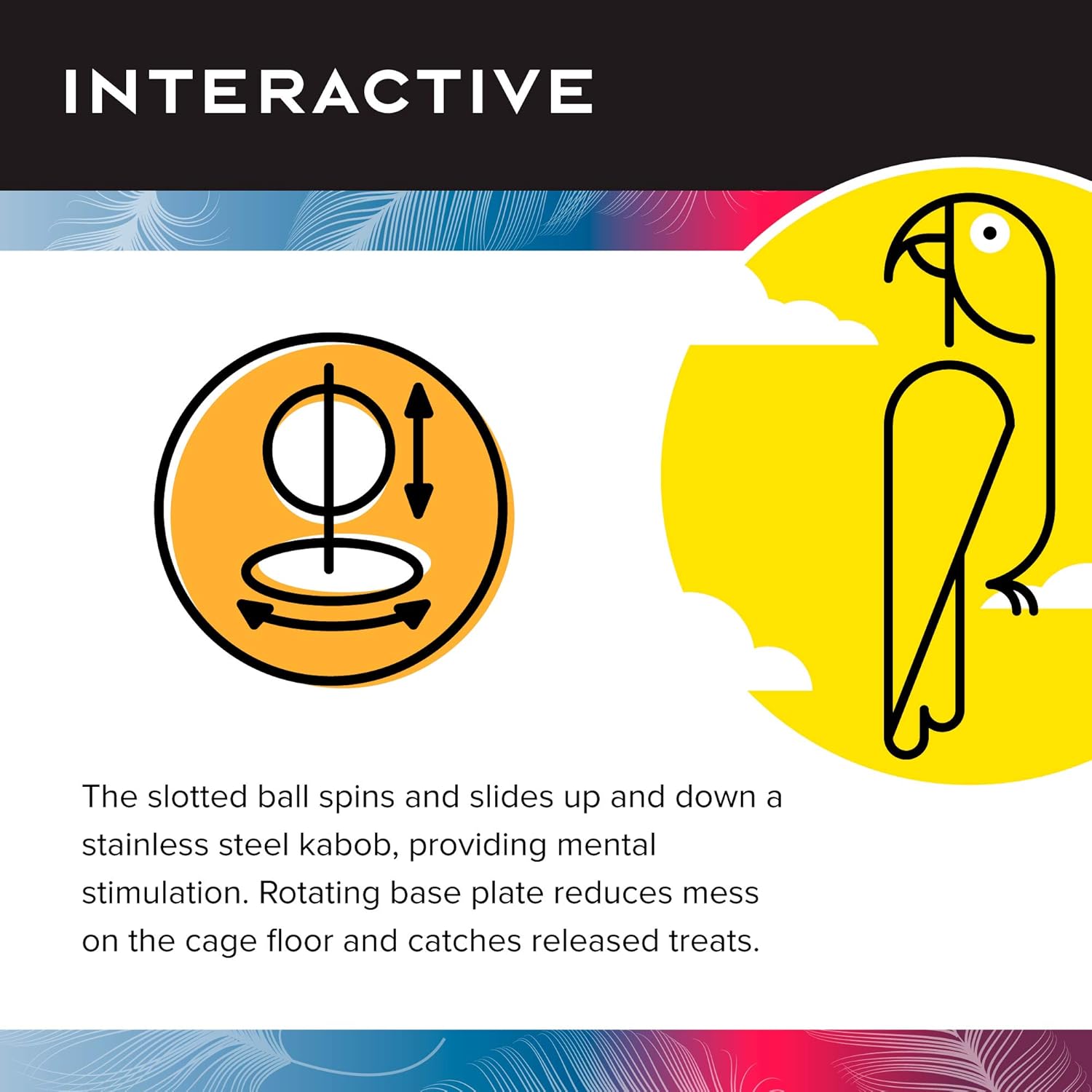 • FUNCTION: The slotted ball spins and slides up and down a stainless steel kabob, providing mental stimulation; Rotating base plate reduces mess on the cage floor and catches released bird treats