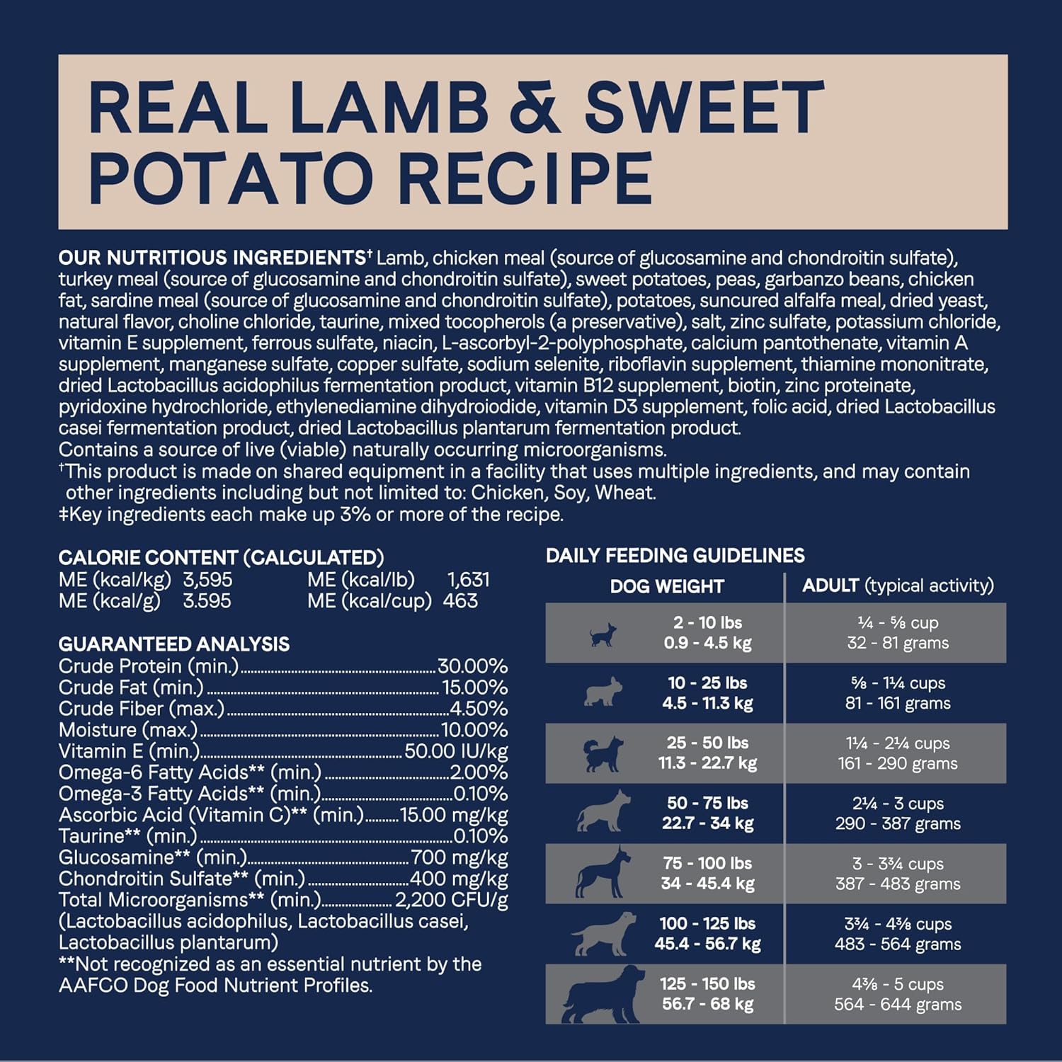 • Real food ingredients for the taste your dog will love. Crafted with real lamb as the first ingredient, paired with whole ingredients like peas, sweet potatoes and garbanzo beans