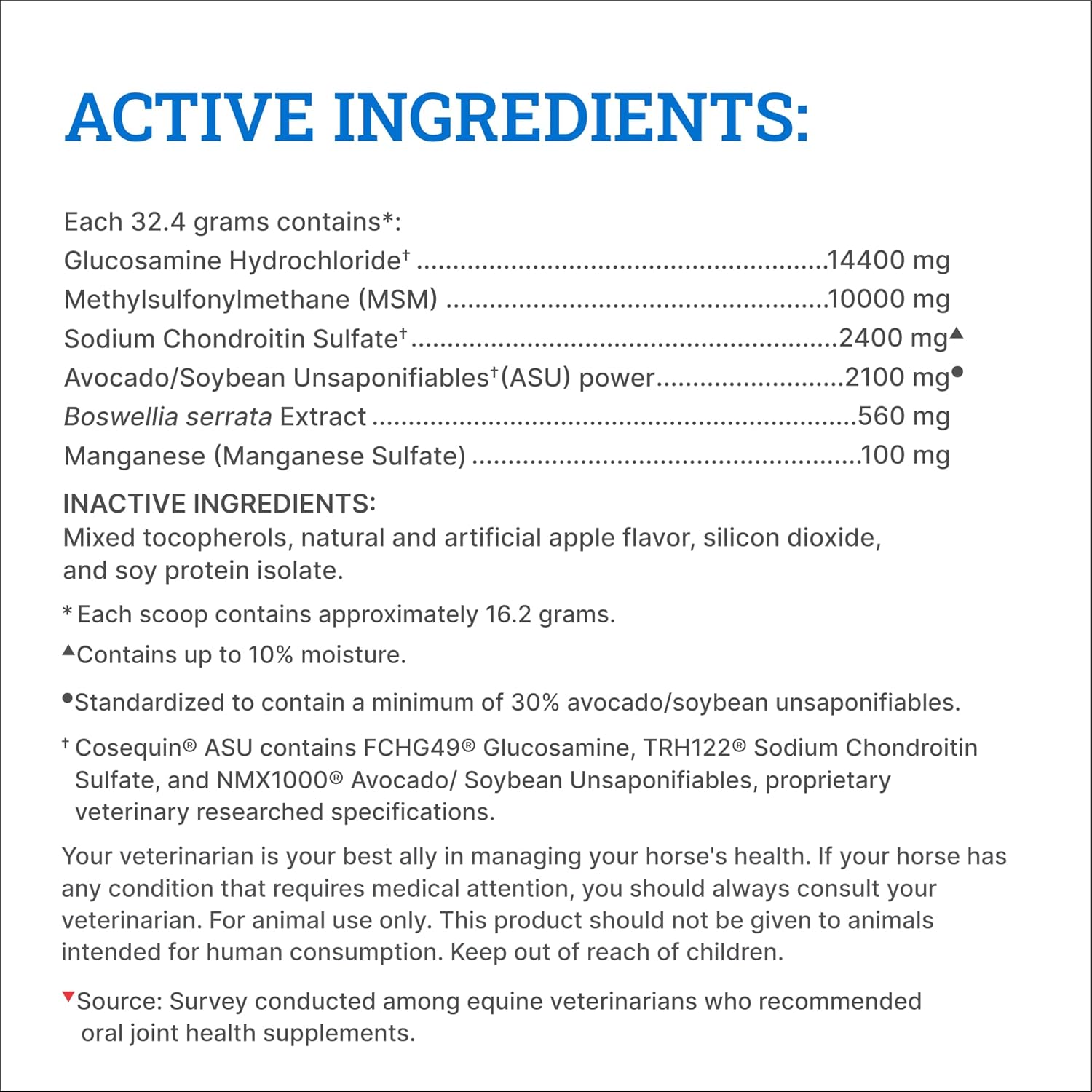 • Joint Health Support for Horses: Cosequin is the #1 veterinarian recommended joint health supplement brand*. This supplement is formulated with glucosamine, chondroitin sulfate, methylsulfonylmethane (MSM), and avocado/soybean unsaponifiables (ASU) to support joint health