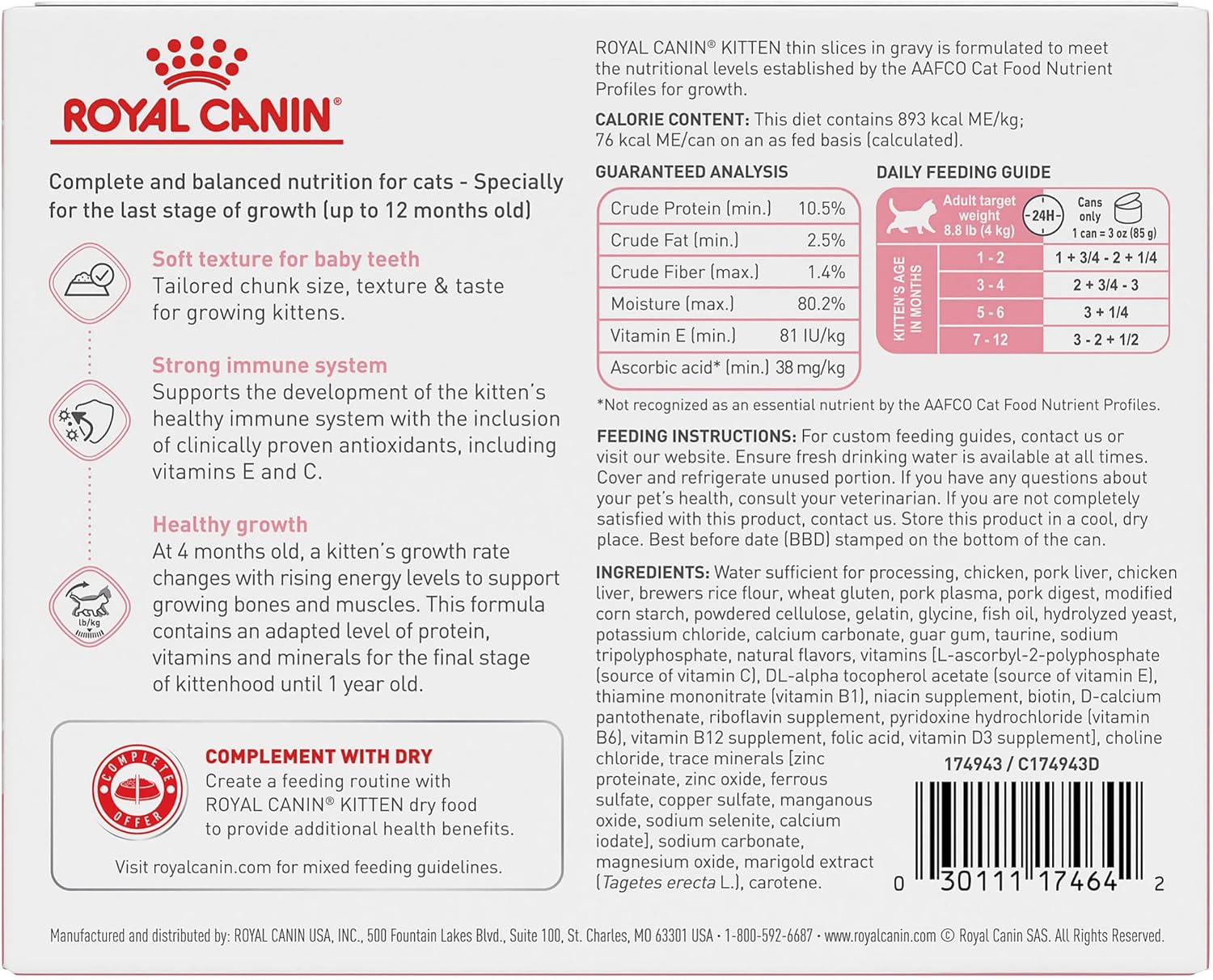 • FORMULATED FOR KITTENS: Royal Canin Kitten Thin Slices in Gravy Wet Cat Food is specifically formulated for kittens up to 12 months old; keeping them on this formula until they reach 12 months of age helps set up a healthy foundation for life