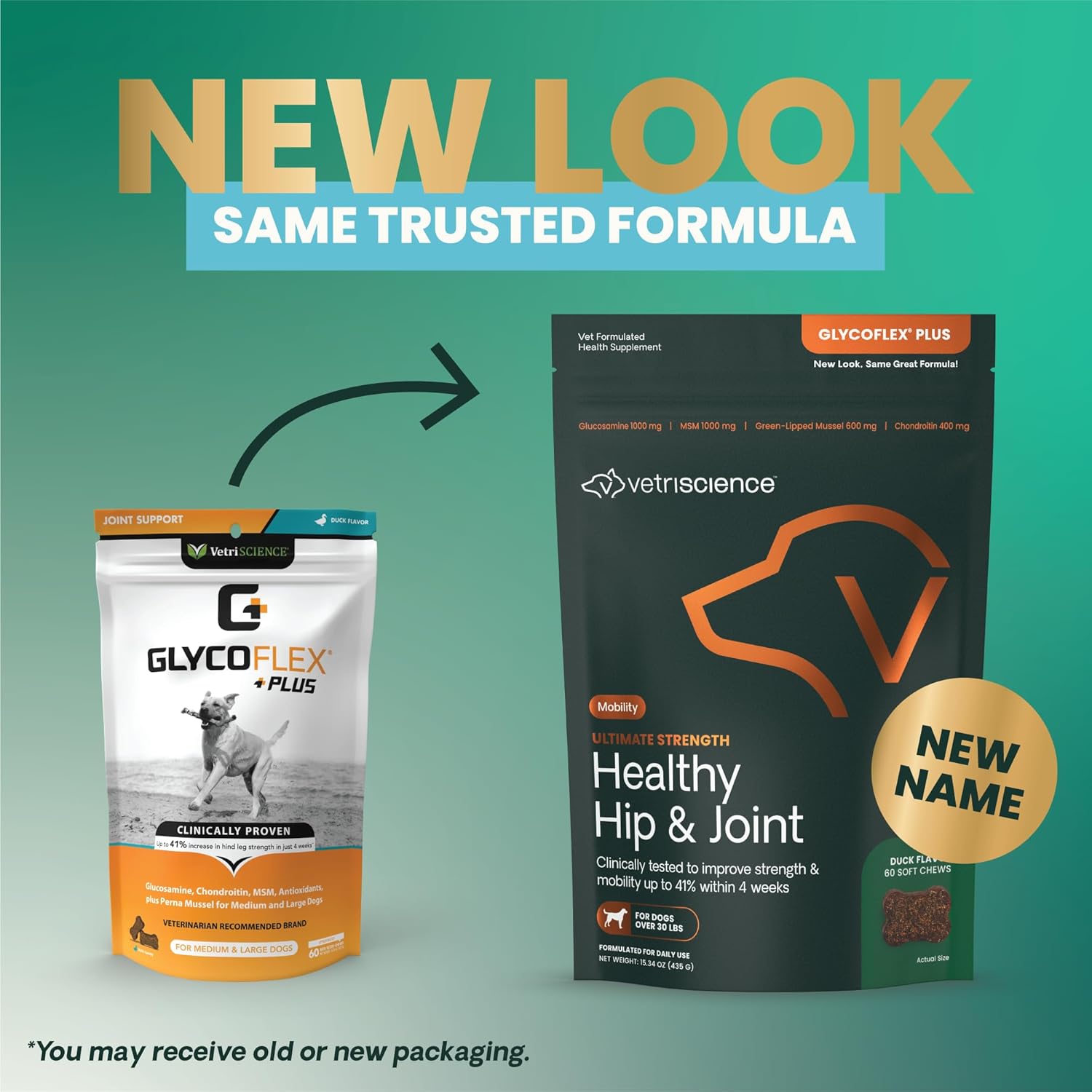 • Glucosamine for Dogs: Ultimate Strength Healthy Hip & Joint (previously GlycoFlex Plus) is our strongest hip and joint supplement for dogs, with powerful levels of active ingredients that work together to help maintain mobility, lubricate joints, and support flexibility