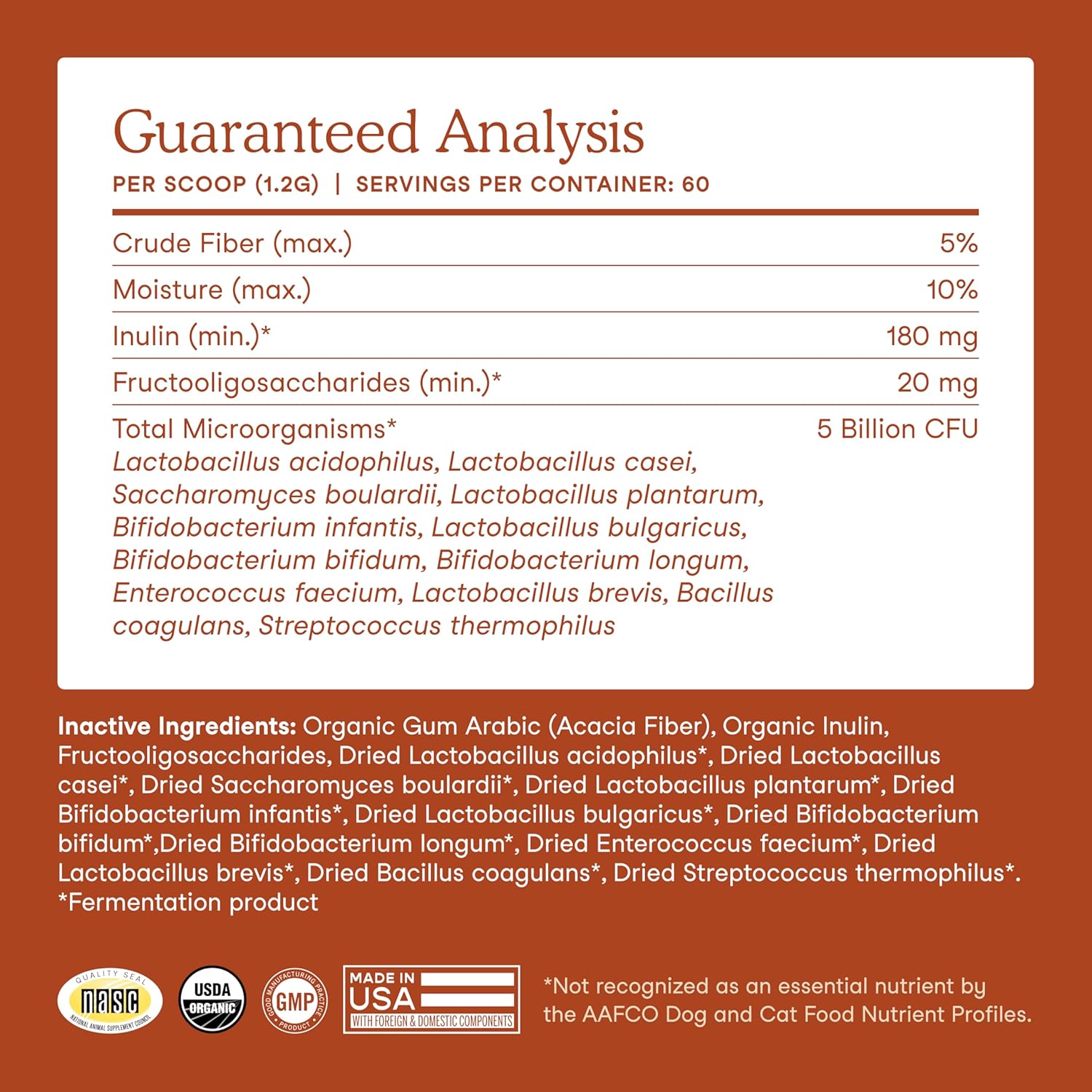 • No fillers: This certified organic dog and cat probiotic is formulated with 12 strains (5 billion CFUs per scoop) and organic prebiotics (acacia, agave inulin and fructooligosaccharides) for a balanced digestive tract