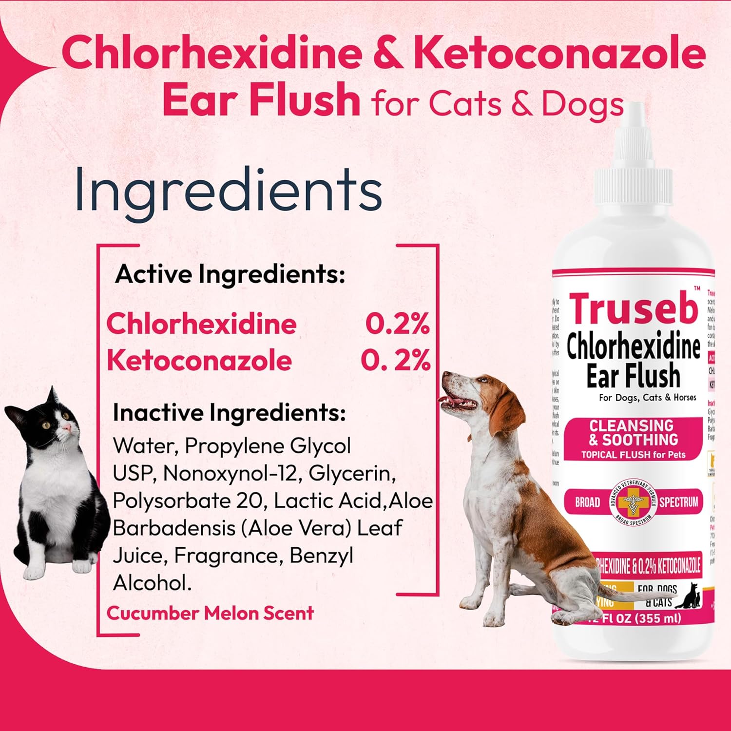 • FORMULATED BY VETERINARIAN & PHARMACIST - Truseb Ear Flush for dogs & cats is Vet & Pharmacist formulated with Ketoconazole 0.2% & Chlorhexidine 0.2% . Key active ingredients can help target the cause of cat and dog ear problems.