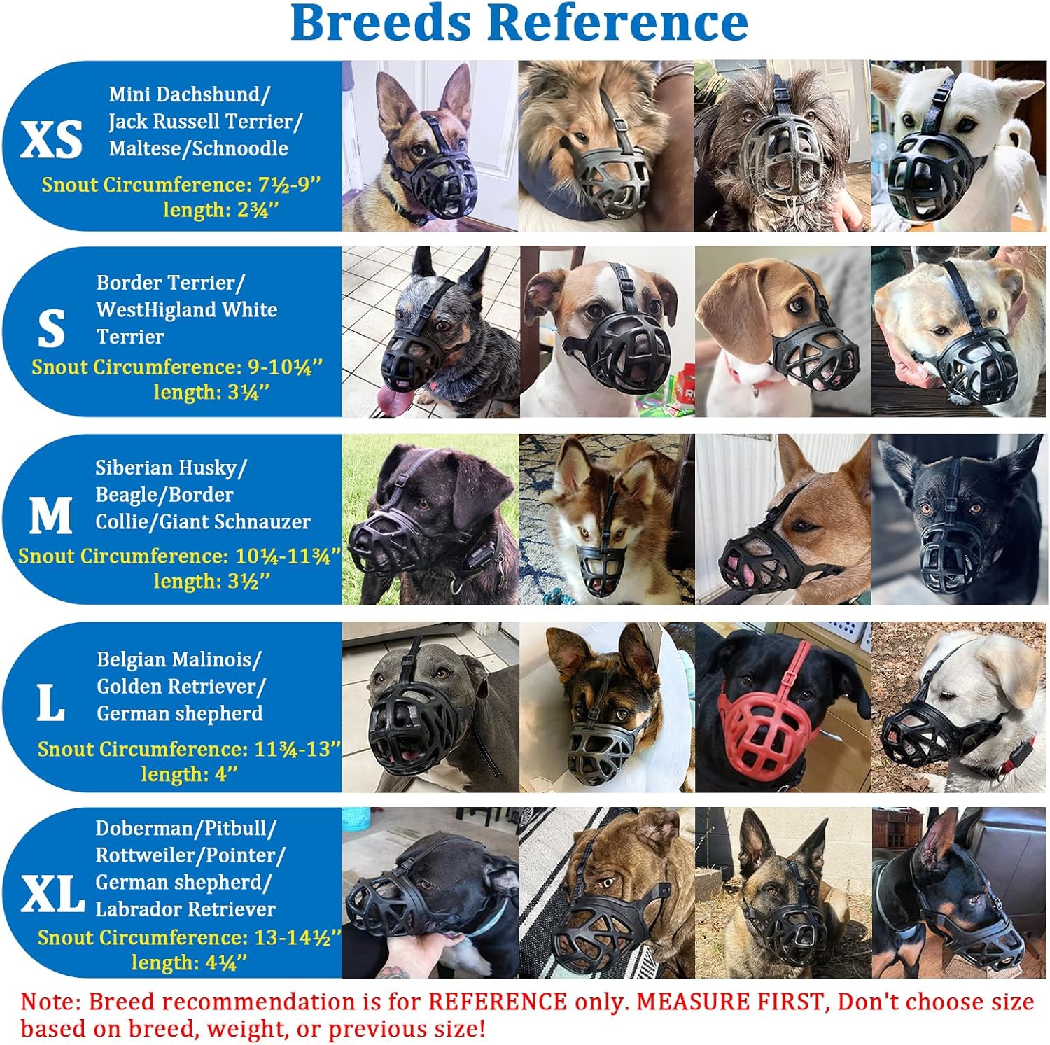 • Dog Muzzle for EXTRA LARGE Dogs (Cir: 13''-14½'', Length: 4¼''): Muzzle for xl large sized dog fits for Doberman, Pitbull, Rottweiler, Pointer, German shepherd, Labrador Retriever, etc. but not for highly anxious dogs and flat-faced dogs like Pug. Please refer to the pictures or videos to measure the snout cir and length before buying the xl basket muzzle.