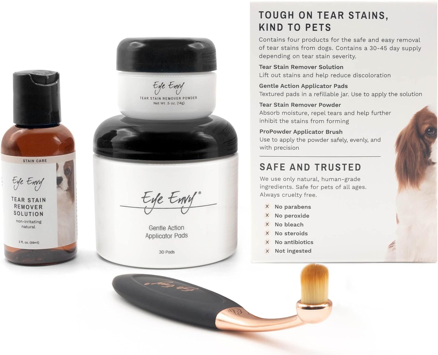 Eye Envy Dog Tear Stain Remover Starter Kit with ProPowder Brush | Stain Solution, Applicator Pads, Stain Powder and Small Applicator Brush | Lasts 30-45 Days