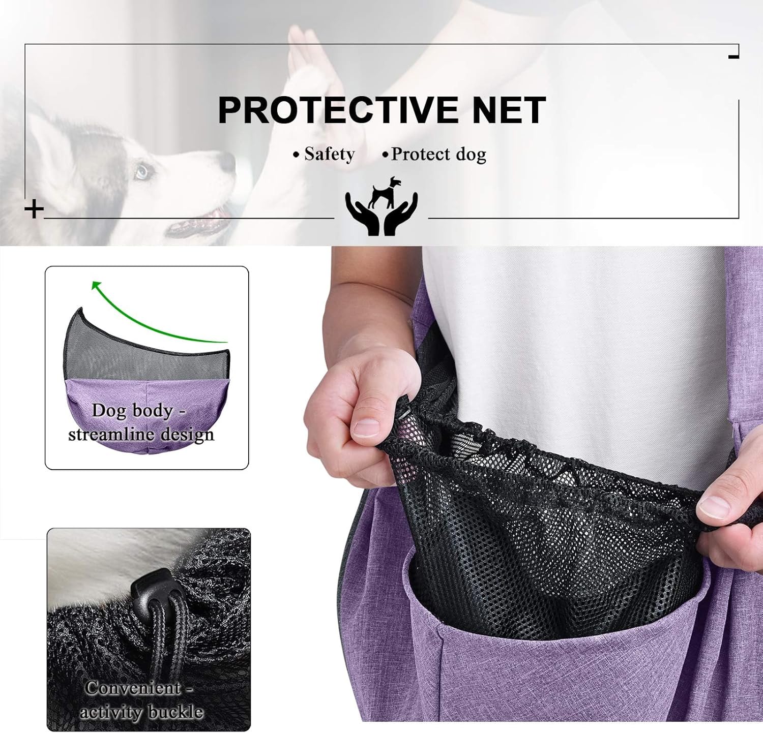 • Double protection device for safety buckle and safety mesh . The front of the mesh is short and the back is long. The design conforms to the body shape of the pet, making it more comfortable and secure. It can effectively prevent the dog from jumping out. To prevent the buckle from slipping, we can make a slip knot behind the buckle after the opening is closed.