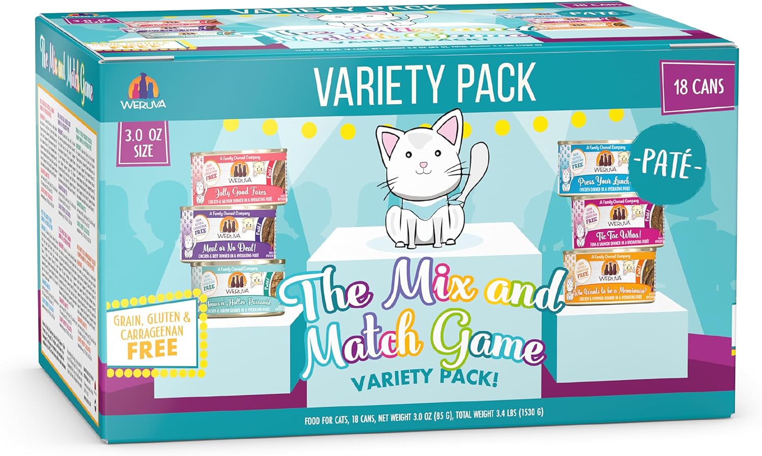 - The Mix and Match Game Variety Pack. Pick a new pate, everyday. Includes all six Weruva canned pate cat food recipes, three of each