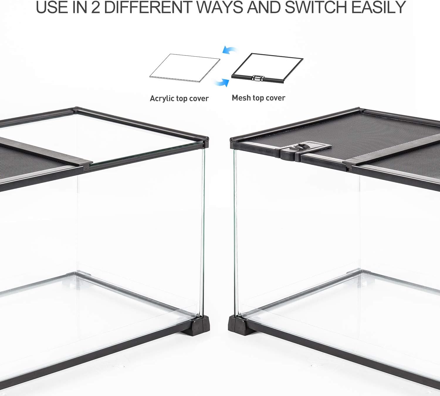 - Dual sliding mesh top cover is for easy opening and closing. (Attached an extra acrylic sliding top cover for better views, use in 2 different ways and switch easily)