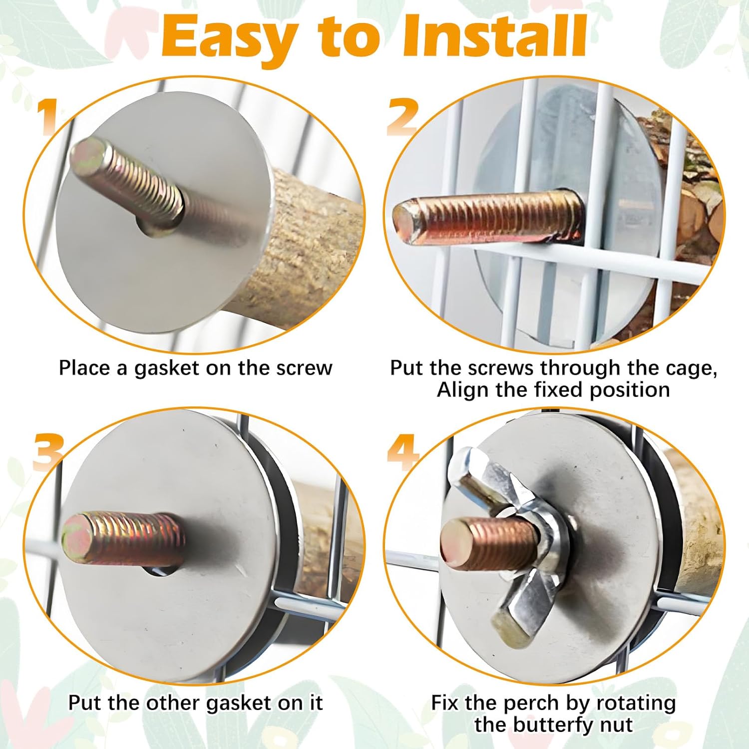 • [PACKAGE] Each package contains 8 perches, including four natural standing tree branches,four natural prickly ash perches,4 high quality 304 stainless steel washers and 4 wing nuts for easy mounting onto the cage