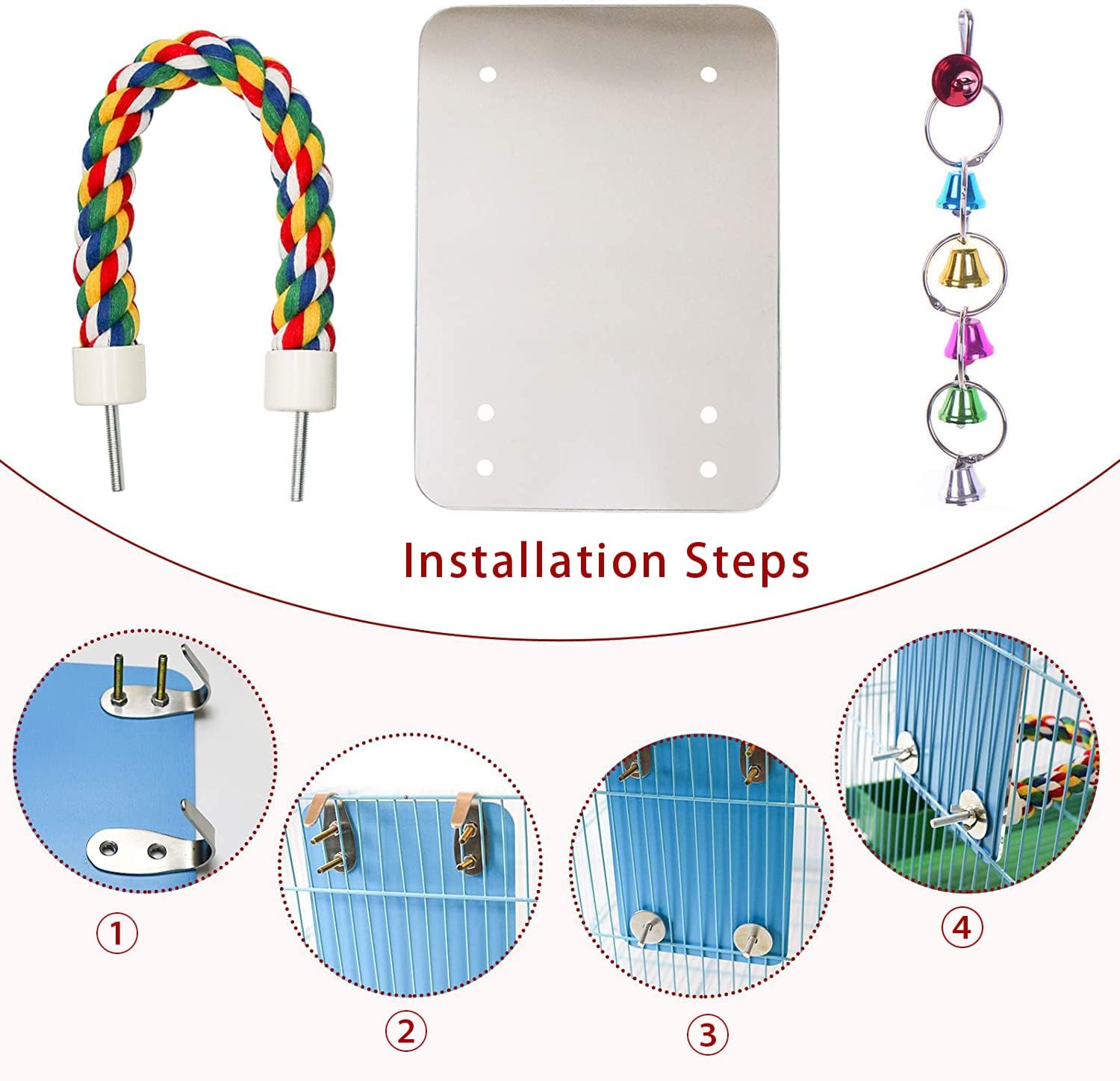 • 【Colorful rope perch】Comfortable for bird standing & safe for bird chewing. It will soothe and exercise tender feet for your lovely birds. you can hang the mirror anywhere in the cage.