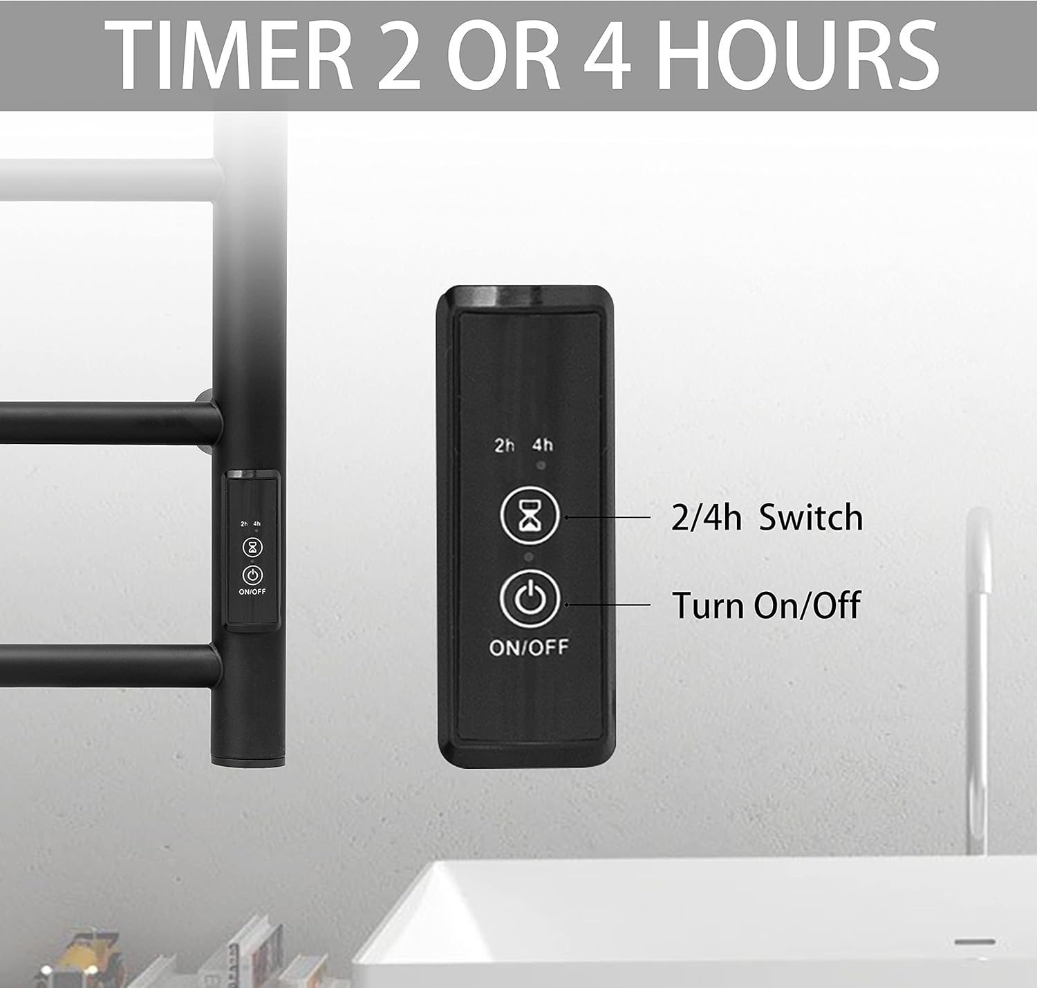 • Timer & LED Indicators: The towel warmer has a built-in timer of 2h or 4h with a visual LED indicator. Press the 2 or 4 hour buttons will dry your towels, and then it will automatically shut off itself when time is up.
