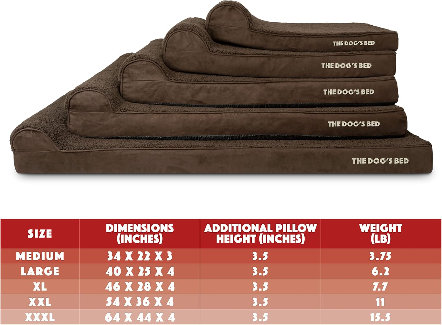 - XXL Brown Plush 54” x 36” x 4” (+3.5" Headrest) waterproof orthopedic headrest dog bed. Solid 2” high density, orthopedic memory foam over a solid 2” base of high stability support foam with covers designed so that your bed fits your home decor seamlessly and your dog can stay close to your family