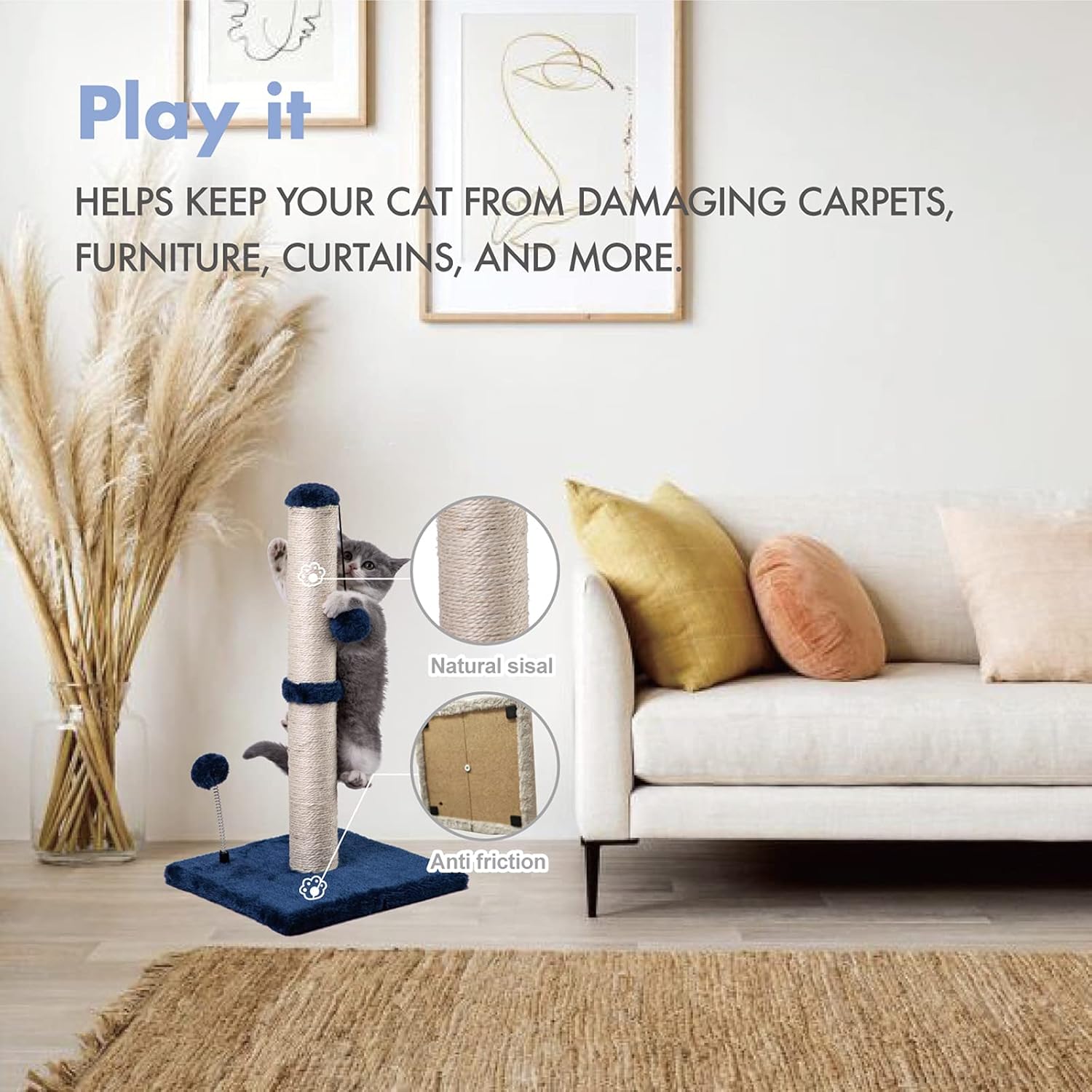 - Protect your furniture - Grab sticks and plush toys combine to attract cats to play and grab, natural sisal is suitable for cats to grab, effectively preventing cats from grabbing furniture