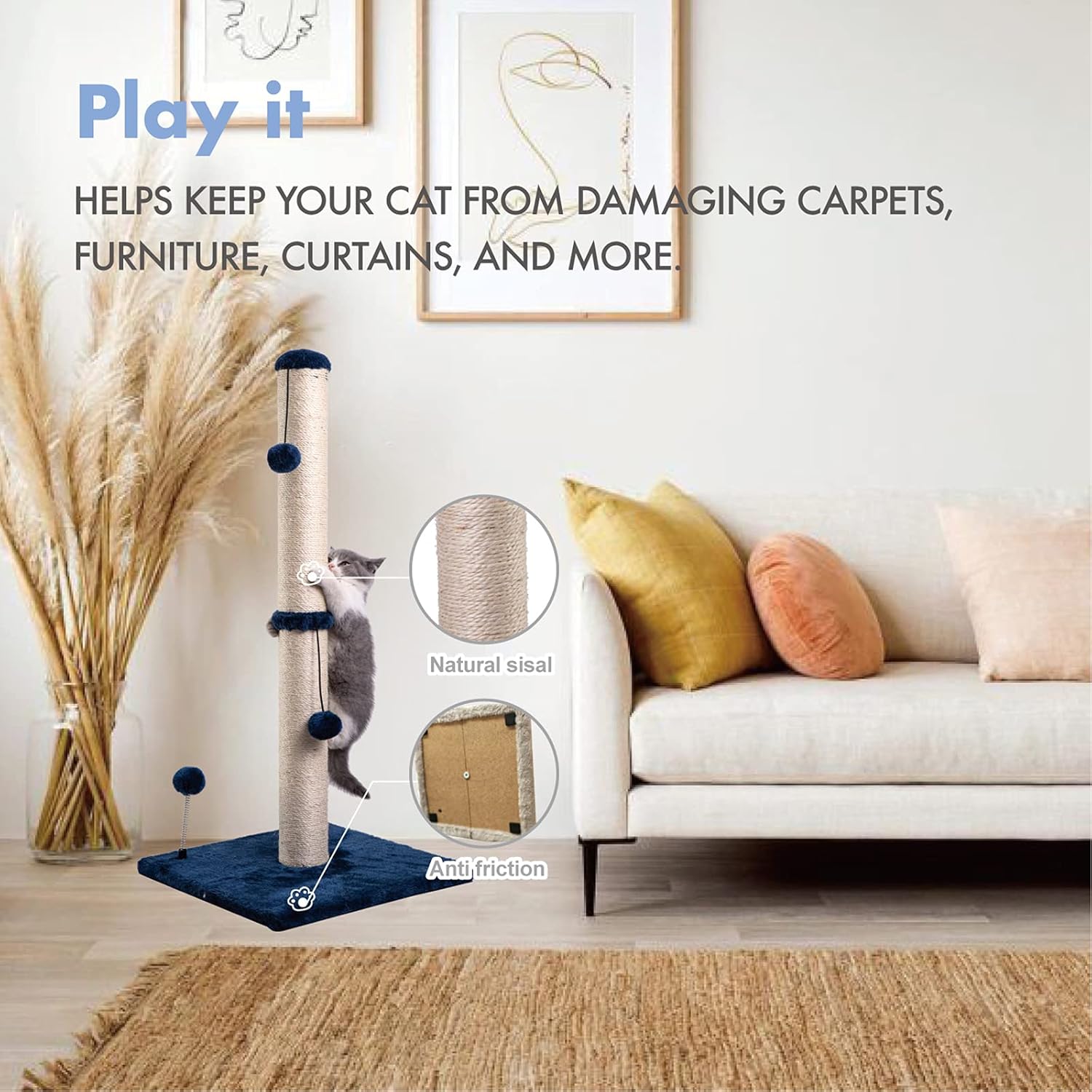 - Protect your furniture - Grab sticks and plush toys combine to attract cats to play and grab, natural sisal is suitable for cats to grab, effectively preventing cats from grabbing furniture .