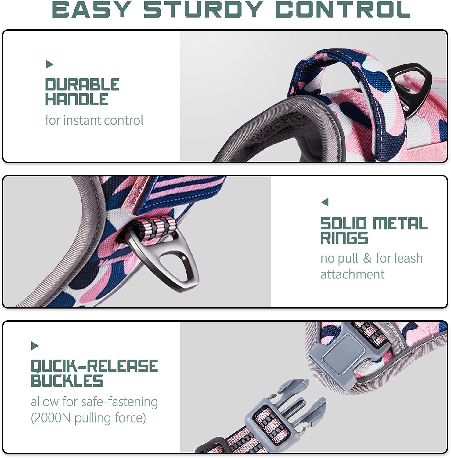 - 🐾NO PULL & STURDY BUCKLES: Provide better dog harness for dogs.🐾 Bumbin dog harness is equipped with 2 Sturdy Metal D-Rings for connecting the leash, reinforced on the extensional part. One Front Clip for No Pull control or dog training. One Back Clip for casual walking or jogging. Our plastic buckles withstand 2000N pulling force to ensure it won't be easily damaged. Recommended Large Dogs, such as Shepherd, Newfoundland, Doberman, Labrador, Alaska, German Shepherd, Large Bulldog, etc.