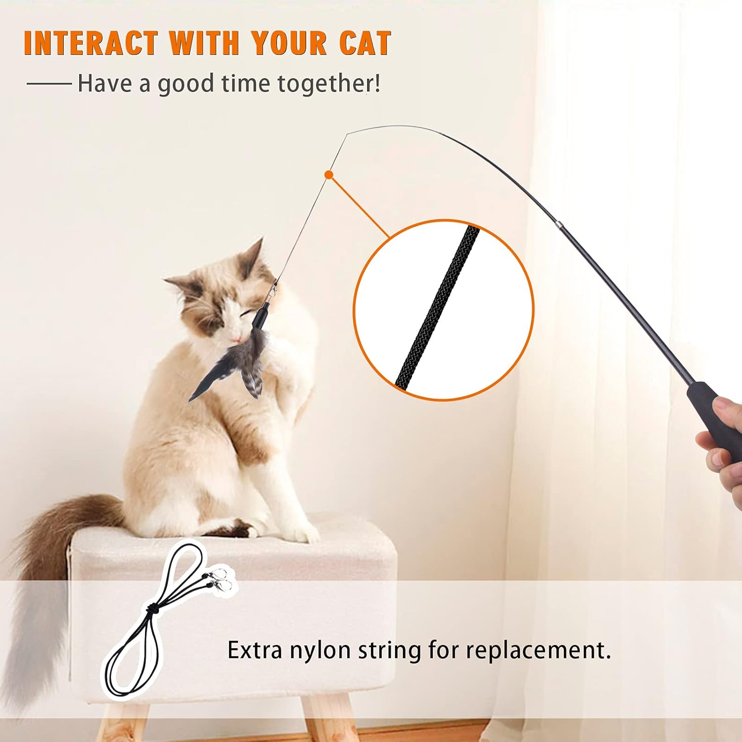 • 【TELESCOPIC POLE】 The cat toy wand can extend up to 38 inches, long distance can help save the hands from the cat's paw scratches. It's also can be contracted to 15 inches and make storage easy. This stick cat toy with a foam handle is lightweight and flexible which can make the hands more comfortable.