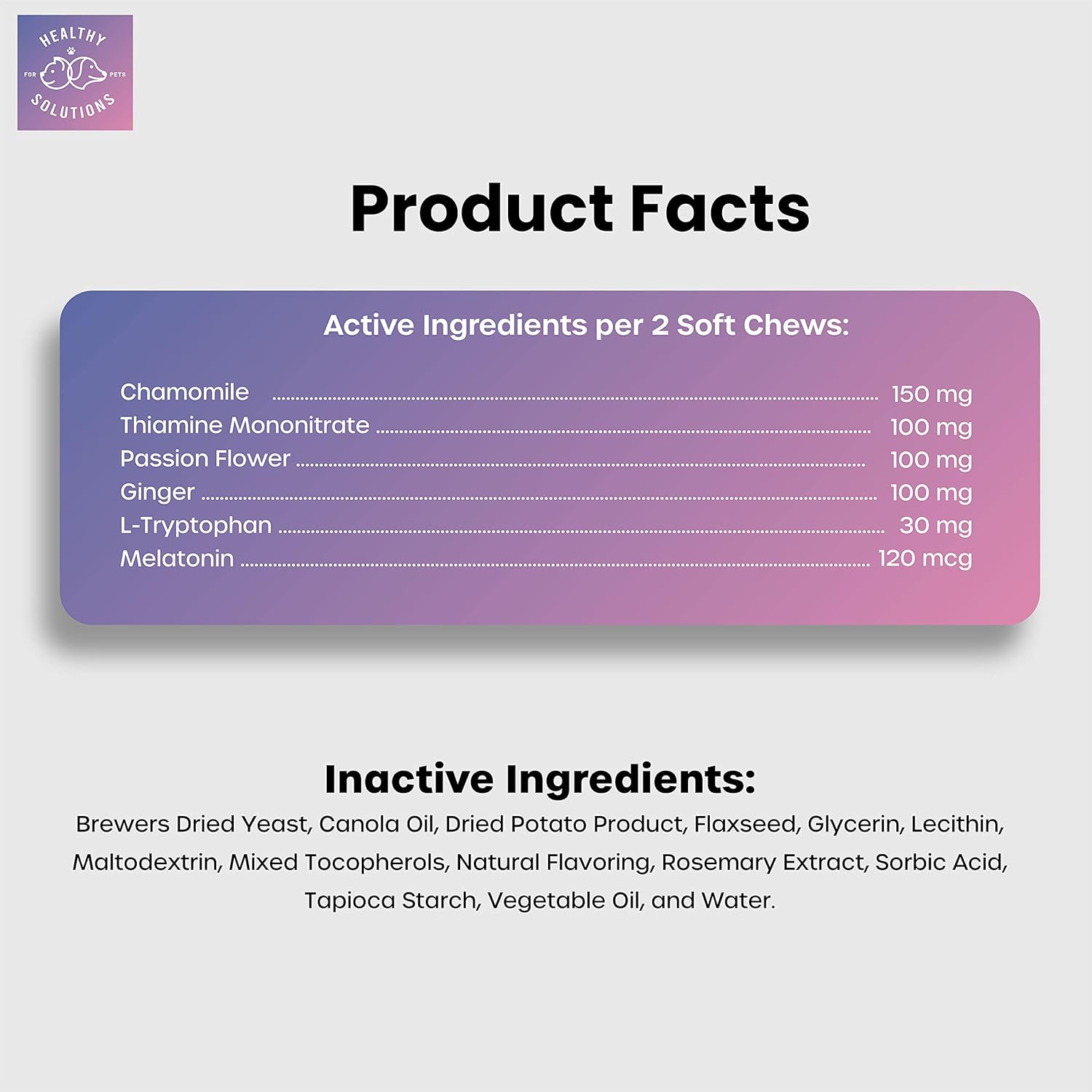 - šø VETERINARIAN FORMULATED -- with Melatonin, Chamomile, Passion Flower, Thiamine, L-Tryptophan, and Ginger to help soothe sensitive stomaches.
