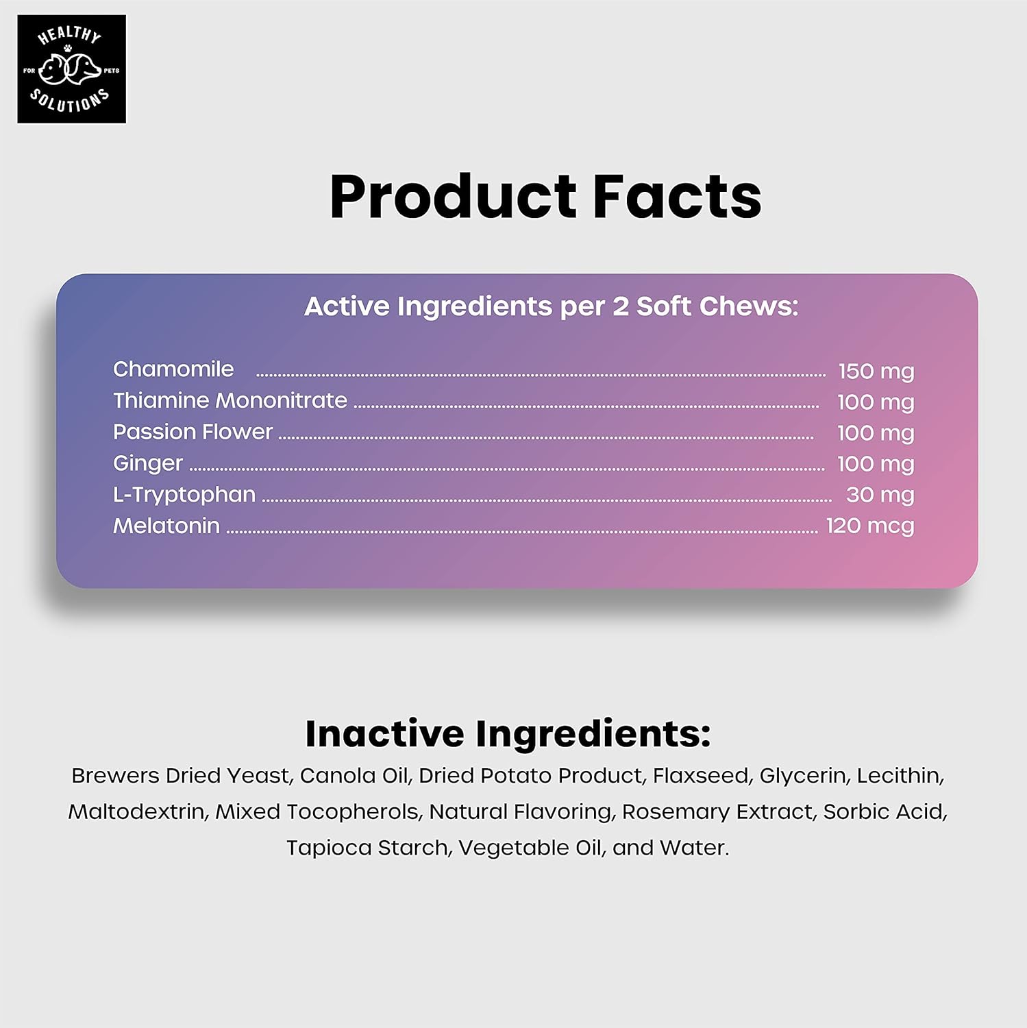 - šø VETERINARIAN FORMULATED -- with Melatonin, Chamomile, Passion Flower, Thiamine, L-Tryptophan, and Ginger to help soothe sensitive stomaches.