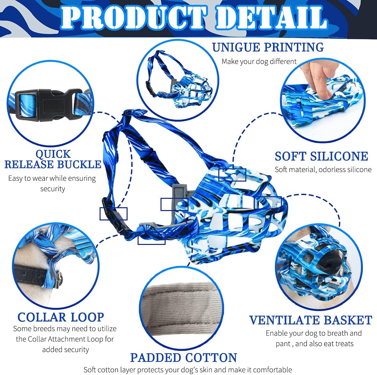 • Soft and Unique: Made of sturdy and safe silicone, it is comfortable for dogs skin and will not rub the dog's nose. There is a neoprene liner at the bottom to increase comfort. With unique printing technology, the appearance is different from the traditional basket dog muzzle, making your dog more attractive on the street