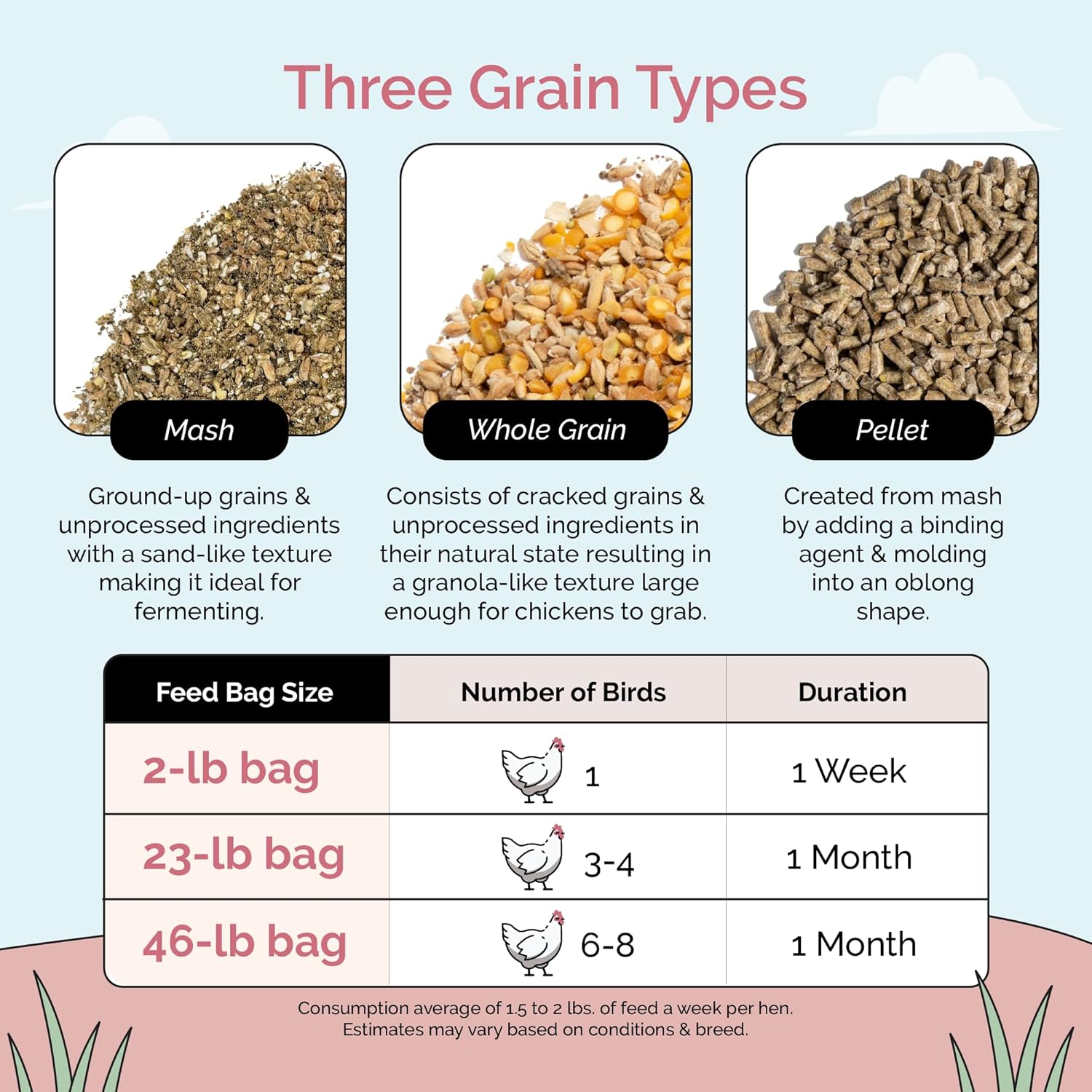 • 3 CHICKEN FEED TYPES: Chickens are picky eaters, choose from 3 feed types; Whole Grain (natural textures, ideal as chickens are visual eaters), Pellet (reduces waste & provides uniformity), Mash (best for chicks & fermenting; may lead to messy eating)