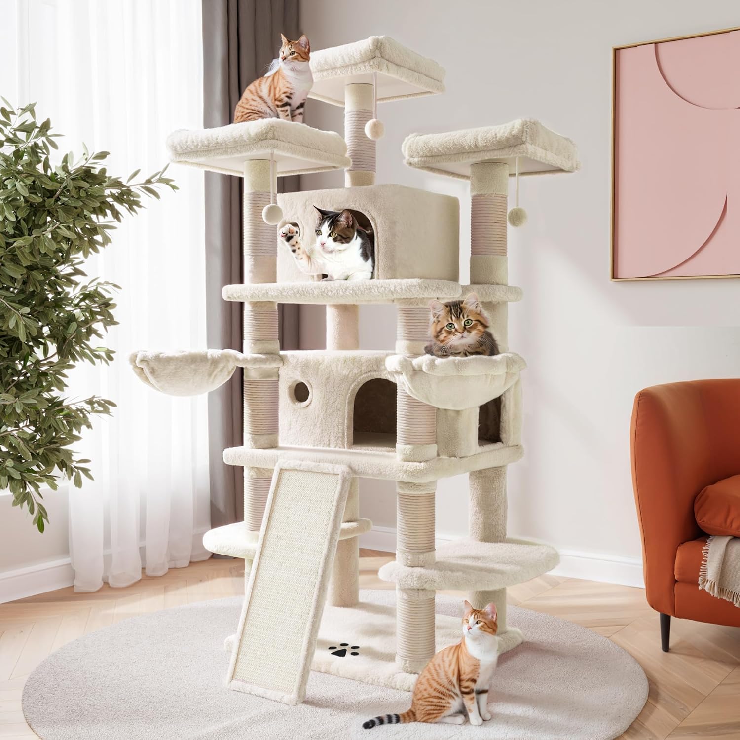 SHA CERLIN 68 Inches Multi-Level Large Cat Tree for Large Kitties/Big Cat Tower with Condo/Cozy Plush Pussycat Perches/Sisal Scratching Posts and Hammocks/Activity Center/Beige