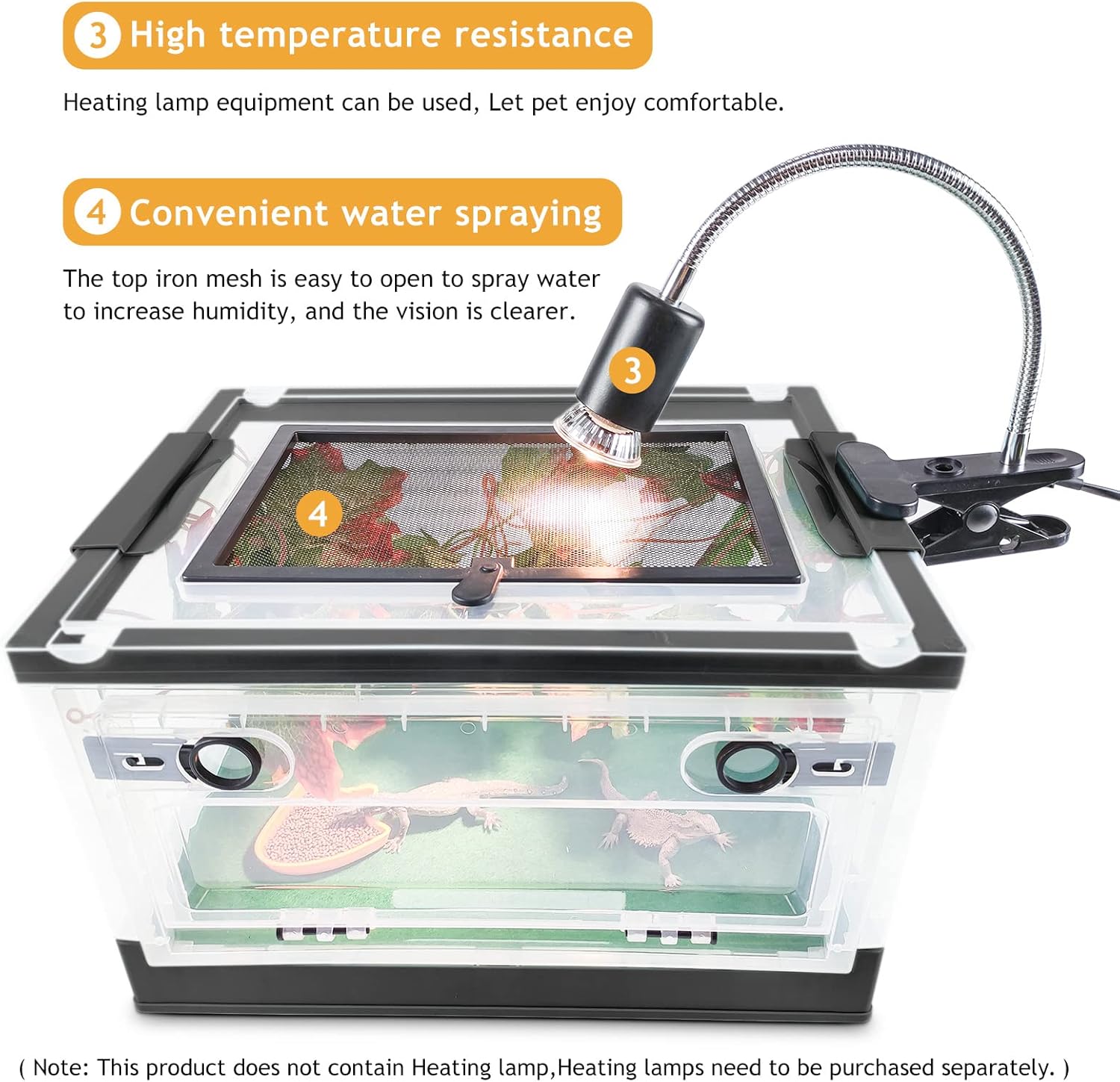 - 5. [Heating lamp can be used] the top iron mesh design can be opened to facilitate the pet spray water to increase humidity, high temperature resistant materials, you can use the heating lamp equipment