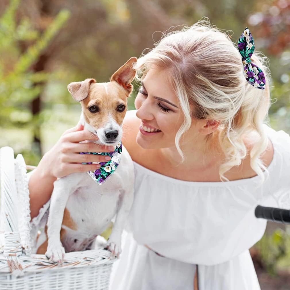 • Matching Bandana and Scrunchies- It’s full of love when your pets is wearing the purple dog bandanas and you are wearing the bow hair ties. When traveling, sleeping, taking photos or daily walking, adorable puppy bandana flowers and floral scrunchie is a pretty accessories. The scrunchie can be worn as a wrist accessory, and as a headband to hold your hair. Beautiful dog drool bib and scrunchie with purple, white florals and green leaves pattern, it’s nice photo props.