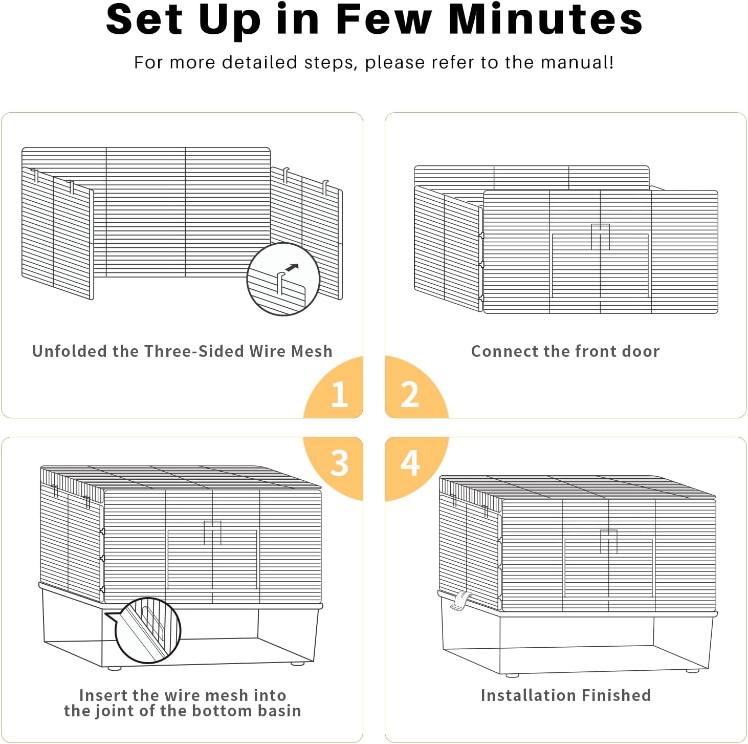 - Easy Assembly: Setting up the cage is hassle-free, thanks to the straightforward assembly instructions and included tools. Within 3 minutes, you'll have a secure and functional home for your furry companion.