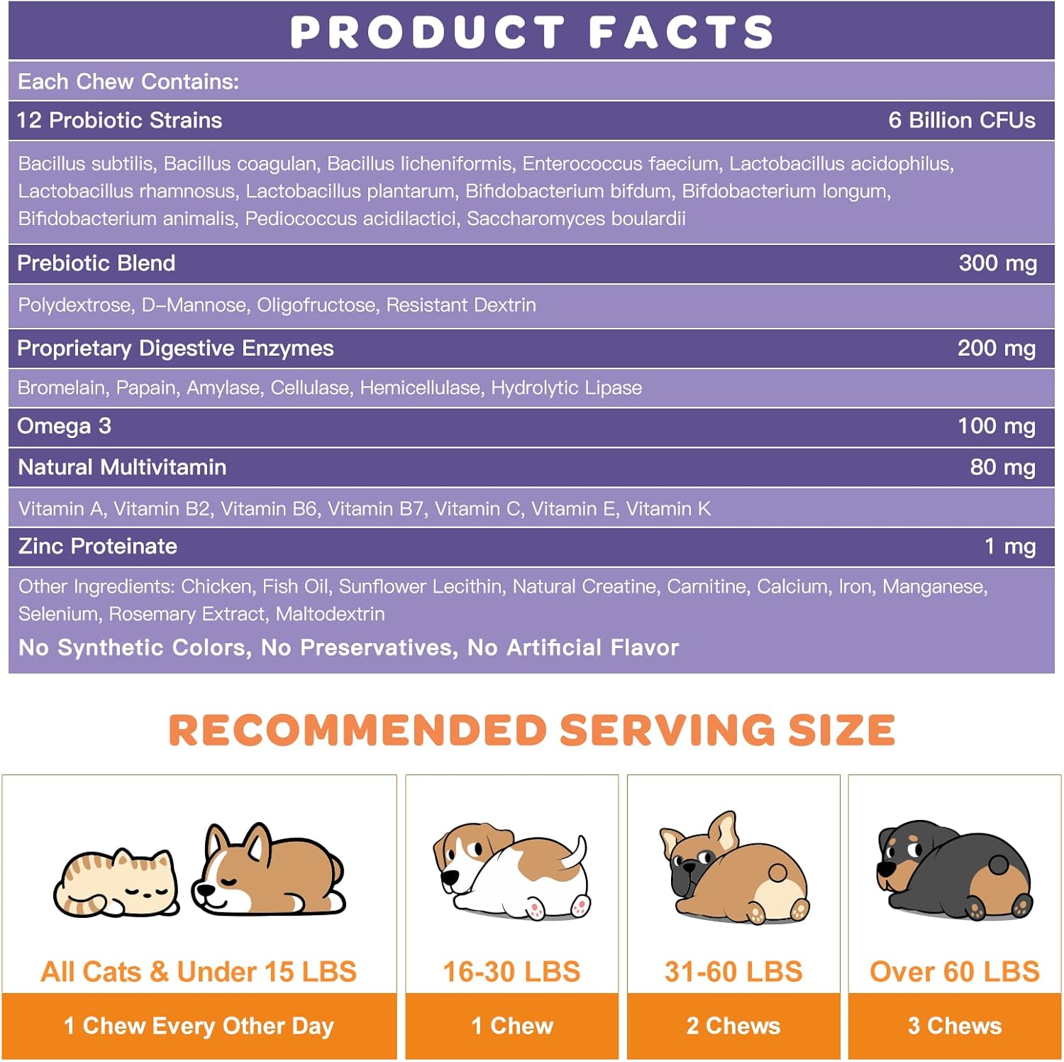- Support Digestive and Gut Health: Our dog probiotic contain 6 billion CFUs and 12 strains of flora that support your pet's tummy. The main soil-based probiotic blend is especially resistant to stomach acid and bile. We also add prebiotics that helps nourish the growth of probiotics. And digestive enzymes can break down food and promote nutrient absorption. It helps relieve bad breath, bloating, diarrhea, constipation and vomit, and help form stools and support sensitive stomach for your pet.