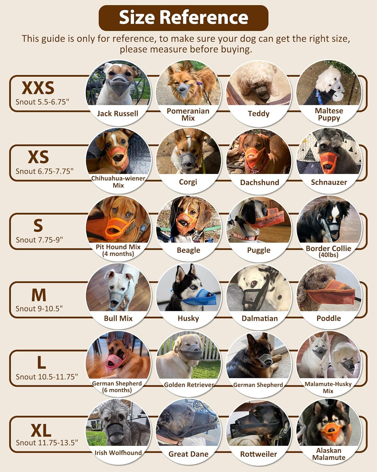 - Dog Muzzle for Small Dogs: The selected size is XXS, with a snout circumference of 5.5'' to 6.75''. Suitable for Schnauzer, Dachshunds, Standard Poodle, etc. Every dogโs snout is unique, please Measure Before Purchasing. Don't select a size based on breed or previous orders. If your dog's measurements are between two sizes, please choose the smaller size. (Note: Not for fierce dogs, overactive dogs, or short-snout dogs.)