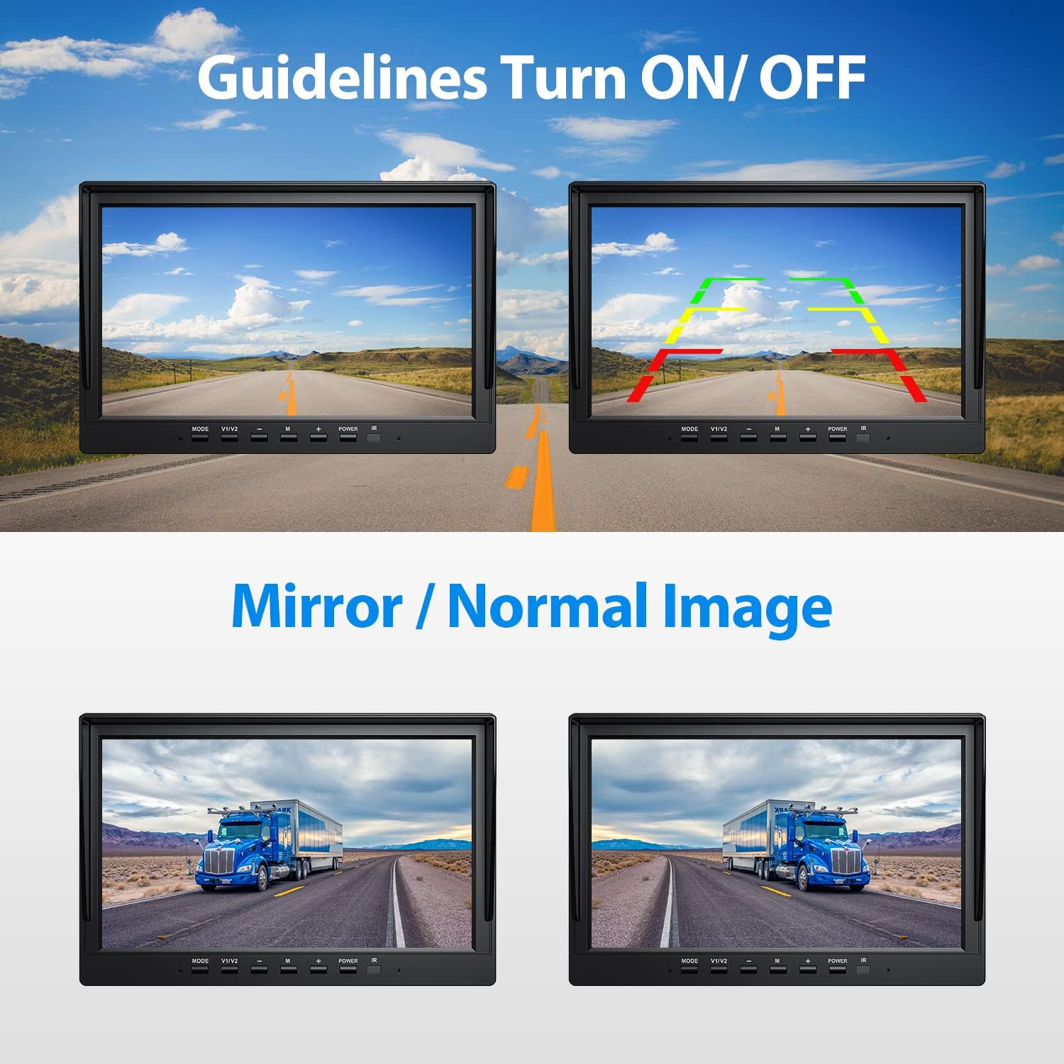 • 👍Split Screen and Parking Guidelines: This monitor will display up to 4 cameras simultaneously or individually for bigger image, no more blind spots. With the parking guidelines, it can help you to judge the distance between your car and the object around it, which can make your parking safer and easier. What's more, you can change the image to front view or rear view, so you can use one of the camera as the front view camera. Monitor dimension: 9.84 inch(L)*6.46 inch(H)