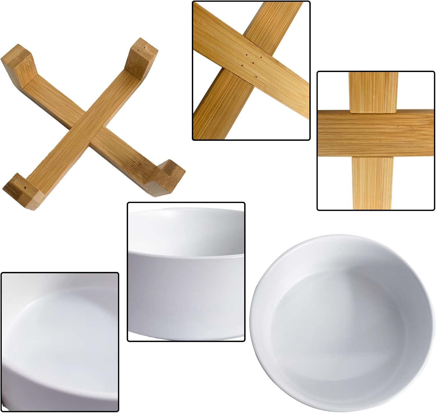 Ceramic Dog Cat Bowl with Wood Stand,Cat Food & Water Bowls Elevated Non-Spill Modern Cute Kitty Dishes Heavy Weighted Round Pet Dishes Set for Kitten Small Cat(White)