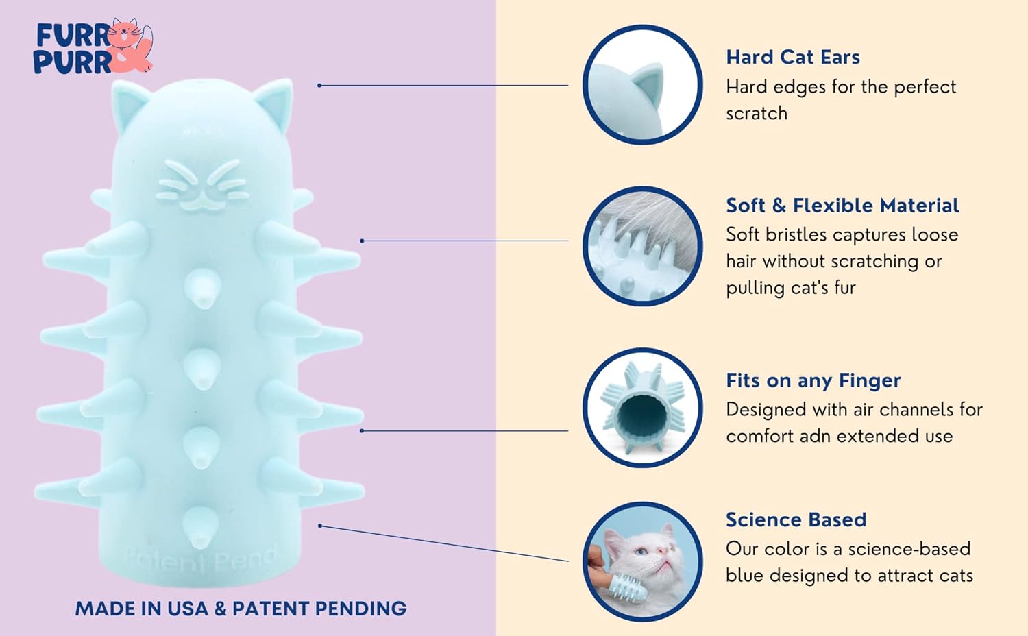 - 【Ergonomic Patented Design】Use the cat brush on any finger, fits the whole family. The ergonomic design includes air channels for comfort and extended use for your finger and endless cat purrs for your pet.