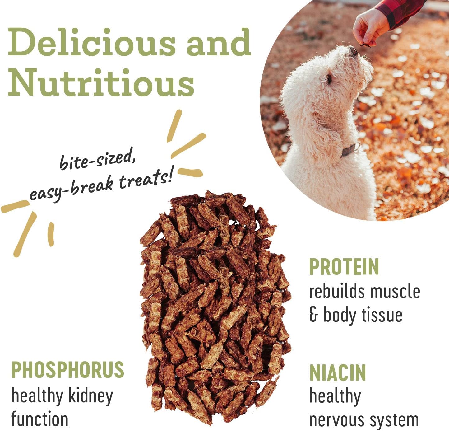 - HEALTH & NUTRITION - Our Turkey Trainers jerky treats are full of vitamins and minerals. Phosphorus helps support healthy kidney function. Niacin supports a healthy nervous system, aiding in the metabolism of carbs, proteins and fats. And healthy levels of protein to help build and repair your dog's muscles and body tissue.