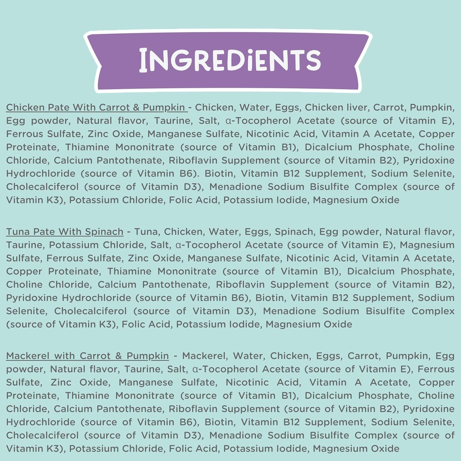 • GRAIN FREE & NON-GMO: Our pate tuna, carrot, & salmon is prepared without any grains, artificial additives, or by-products, as our goal is to feed cats the way nature intended. We always source wholesome ingredients to promote optimal health and nutrition