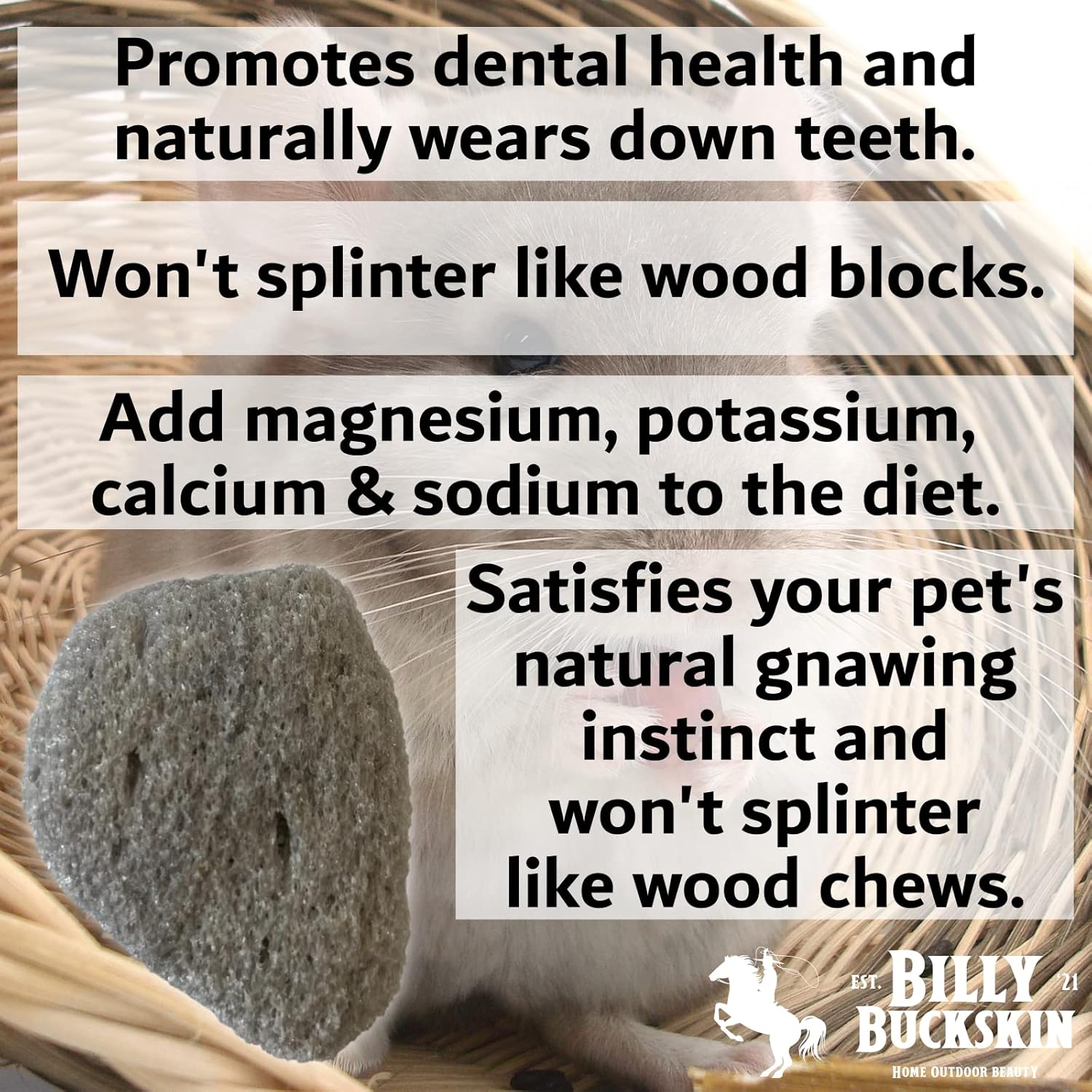 - NATURAL CHEW TREATS WITH NUTRIENTIONAL BENEFITS - Billy Buckskin Pumice Rabbit Treats are more than just engaging chew toysโthey naturally support dental health and offer trace mineral benefits for rabbits, guinea pigs, hamsters, chinchillas, and other small pets. Ideal for daily cage enrichment, these nutrient-rich pumice stones help wear down teeth safely while promoting activity and overall well-being.
