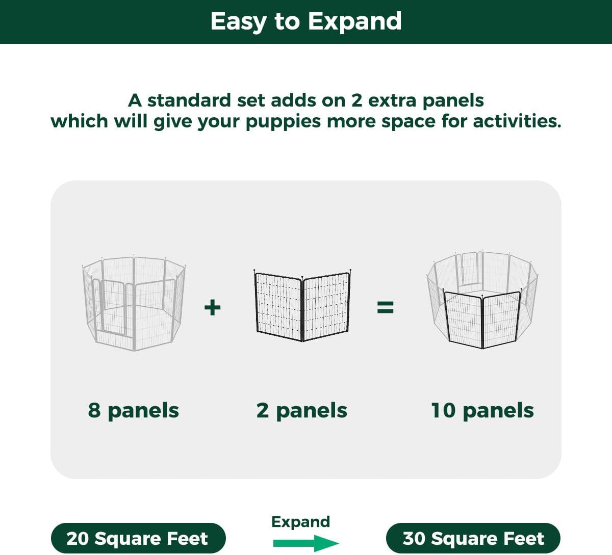 - Super easy to assemble: It won’t take you more than 5 minutes to assemble these portable dog fences as well as pack them away due to the rod-connected design. Meanwhile, panels can be added or removed freely to give you a fully flexible area and arrange the dog pen in any shape you need.