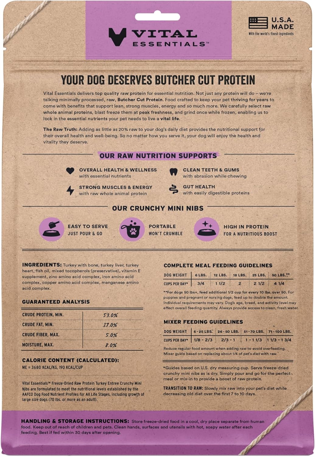 • CRUNCHY FREEZE-DRIED RAW TURKEY DOG FOOD: Vital Essentials Crunchy Freeze Dried Dog Food packs more protein than industry standard into every bite to deliver the peak vitality your dog deserves, especially when compared to dehydrated dog food. This complete and balanced freeze-dried raw dog food is made with premium butcher cut turkey, responsibly sourced in the USA.