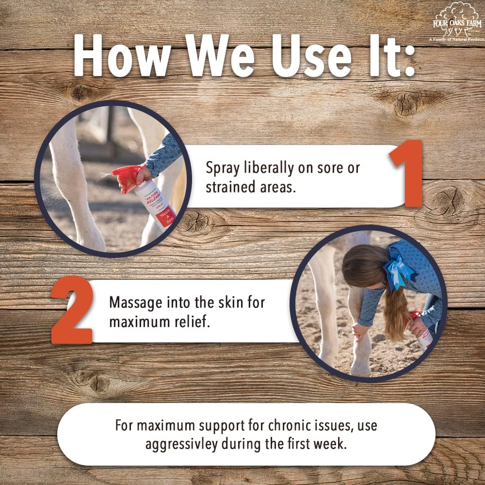• Get Straight to the Ache: Natural Release Muscle Relaxant Spray works in minutes to help reduce equine muscle and joint stress, arthritis, tendonitis, discomfort, bruising and inflammation. Can be used before or after physical exercise - we recommend both.