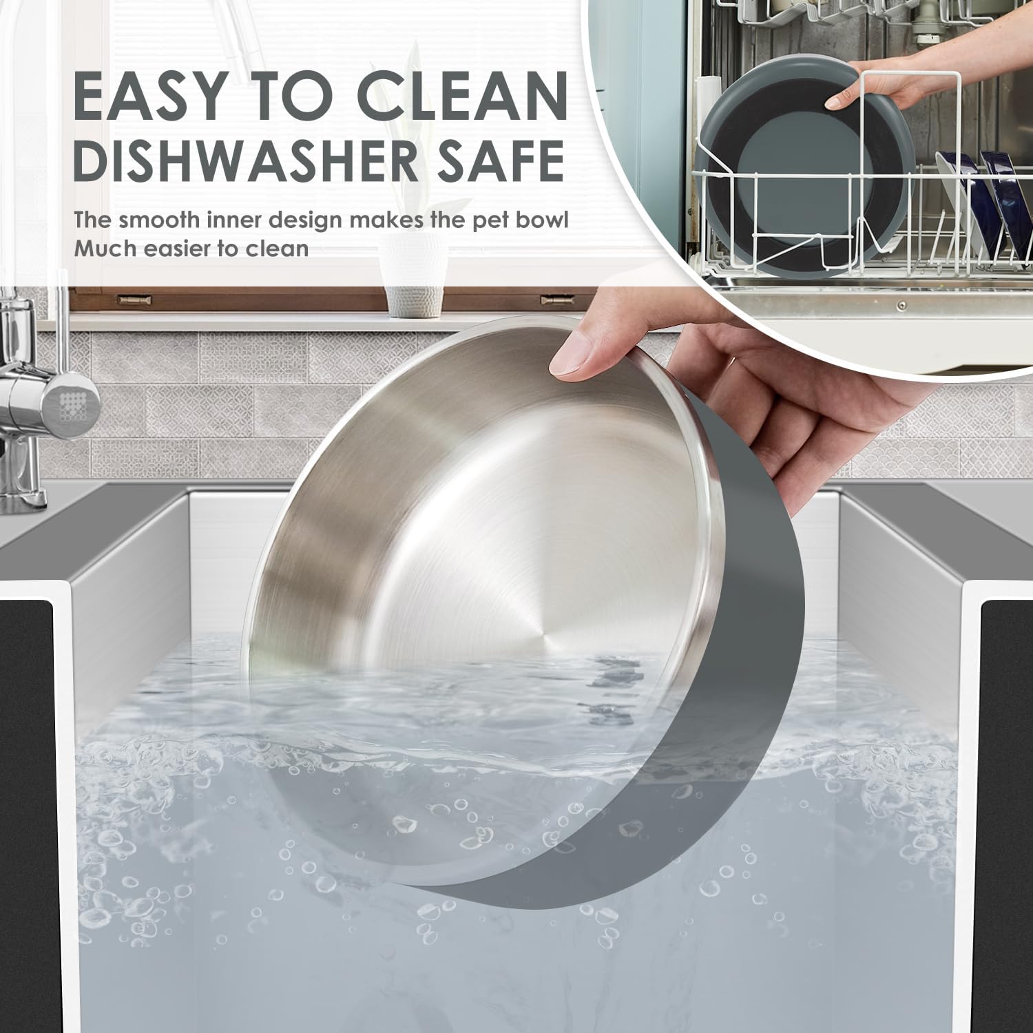 • SAFETY DESIGN-Pet feeding bowl adopts mirror polishing process, which has an elegant look and smooth touch. The flat edges will not hurt the dog's tongue, rust-proof and easy to clean.