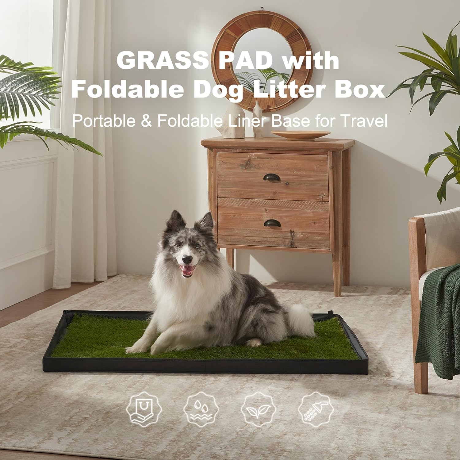 Dog Grass Pad with Foldable Dog Litter Box, Extra Large Liner Base (44”×34”) for Balcony, 2 Artficial Grass Pee Pads for Dogs, Pee Pad Holder, Potty Training