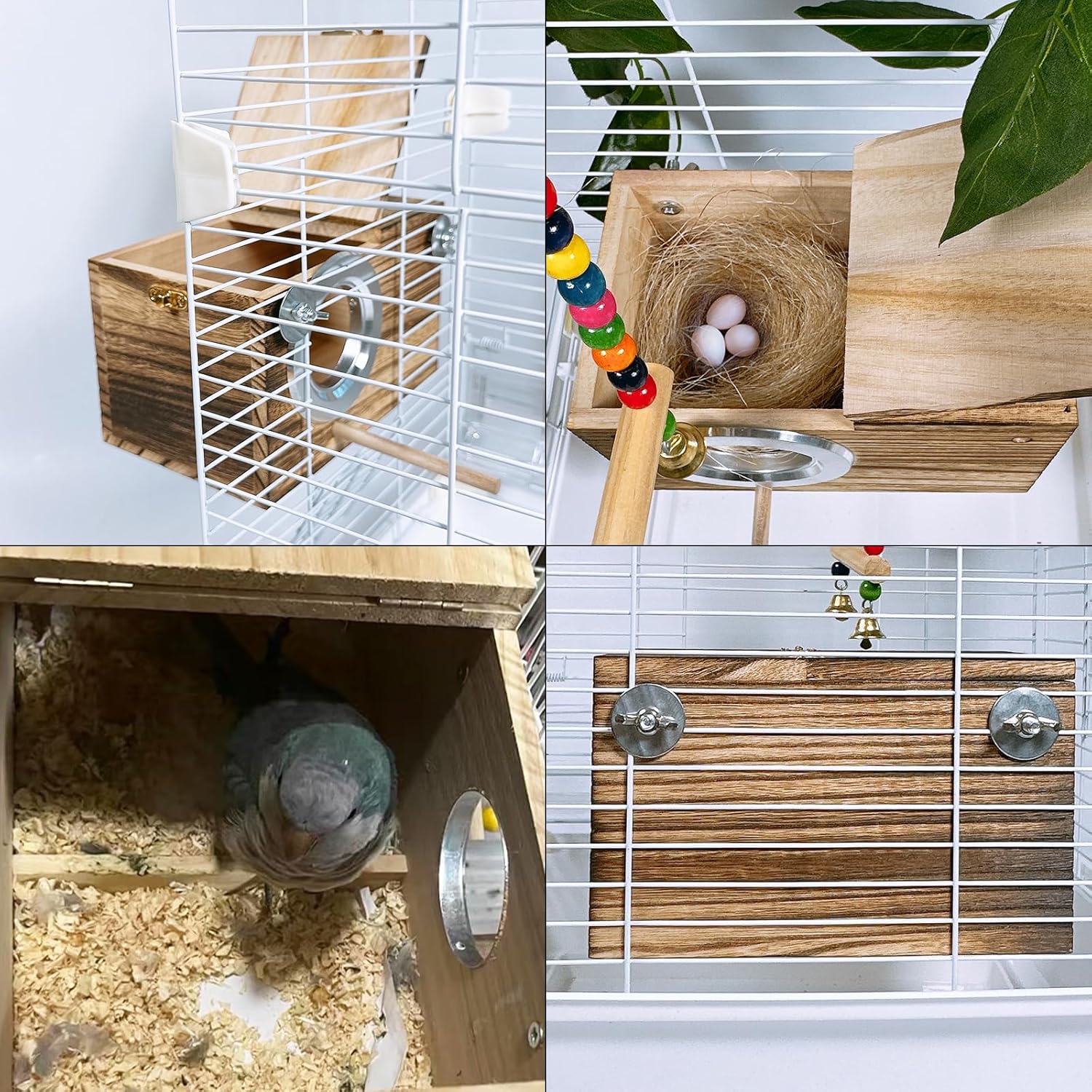 • 【Practical Design】 The parakeet parrot nest box for cages and habitats is designed with built-in partitions to prevent bird eggs from rolling. The metal components are electroplated to prevent rusting. The smooth round entrance allows your bird to enter and exit easily without injury. The perch at the entrance facilitates birds entering the nesting box while also satisfying the parrot's habit of perching on the shelf.