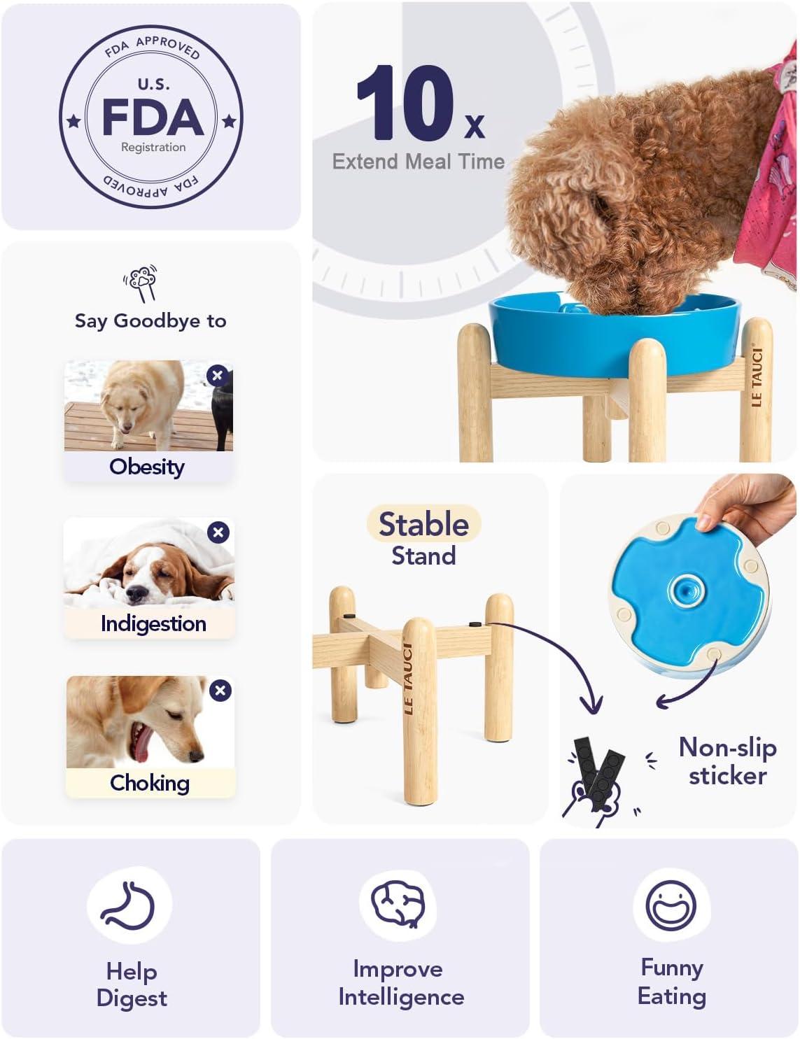 LE TAUCI Ceramic Slow Feed Dog Bowls, Elevated for Small Breeds, 6 inch, Blue, Non-slip