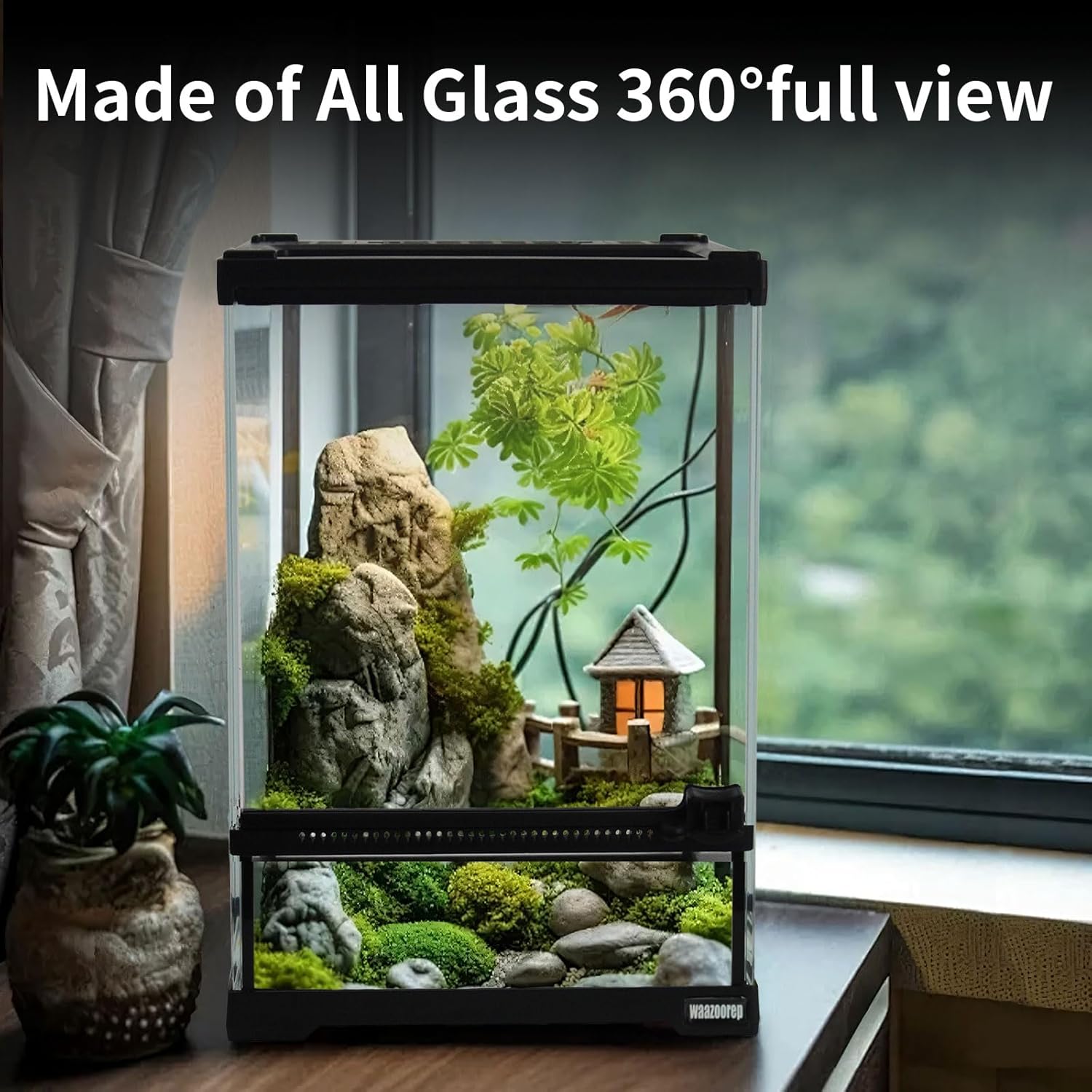 - 【Compact Design Mini Glass Terrarium】: Made of premium thick glass base for extra safety. The front door opens with one hand separately, making this reptile terrarium easy to access and easy to clean, decorate and maintain. Specially designed locks also help prevent escapes