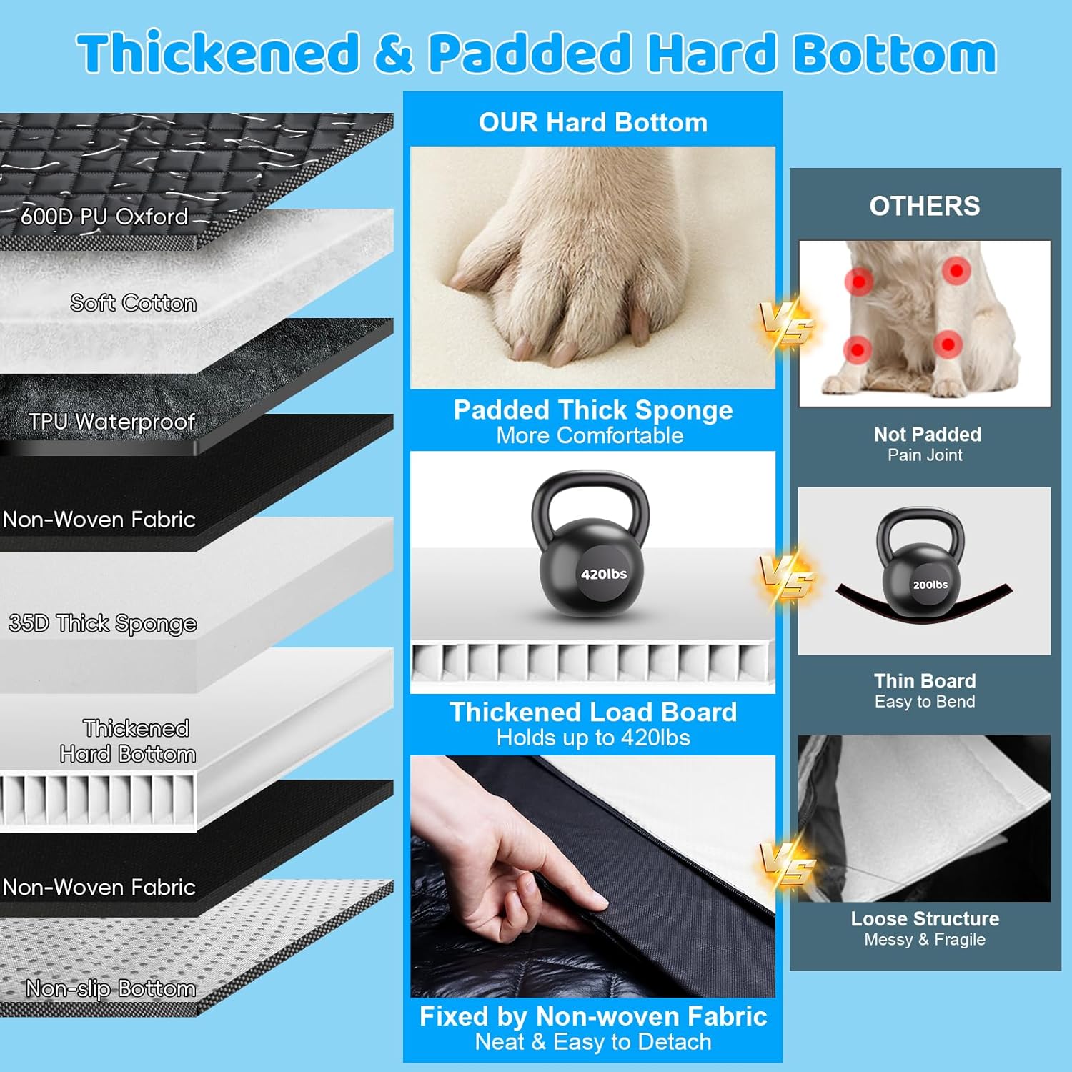 - Ultimate Comfort: Equipped with 8-layer protection including a layer of 35D sponge, this hard bottom dog seat cover delivers excellent comfort for pets during long rides. Compared to the competitor's single-layer thin board design, our padded hard bottom greatly reduces your dogs' joint pressure, while the non-woven fabric layer ensures durability and effortless removal for deep cleaning of the dog car seat cover