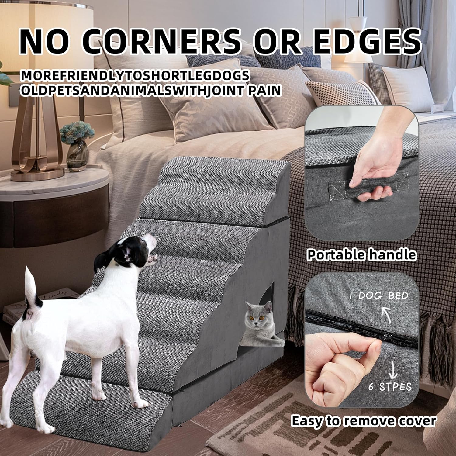 • [2025 Special new design dog stair]: Our dog steps has a total of 7 steps, consisting of 6 tier and with1 big dog bed. The connection method adopted as strong zipper form, which is very stable,if you want to buy different height stairs ,trust us ,buy this one ,because you can get 6 and 1 big dog bed pet stairs as long as you purchase this 7-tier, which can be used at very high place and dog can sleep on the big bed .Trust us ,It is right for choosing us !