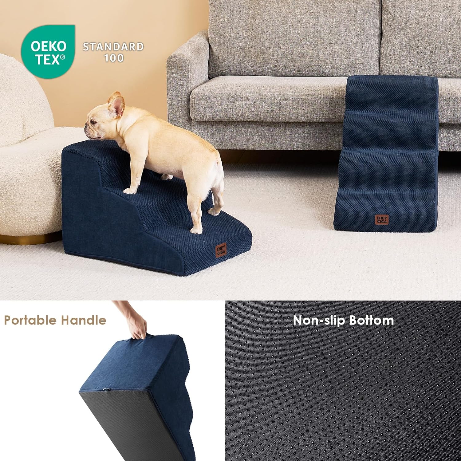• SPECIFIC AND STEADY DESIGN - 33D density of pure foam make this stair more steady when your pets walk on. The dog bed stairs can provide strong support for pets in the walking process. Low angle slope design can better protect your pet's joints.