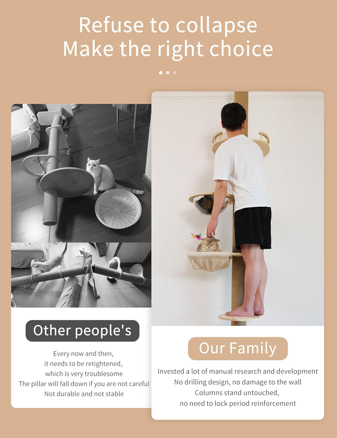 - For tall cat trees, stability is crucial: the thickened catback base, ĺŠ ç˛— (thickened) sisal-wrapped scratching posts, and 3 top fixtures work together to ensure the tree's stability. A total of 8 sisal scratching posts allow for flexible assembly, with heights sufficient to fit most household interiors.
