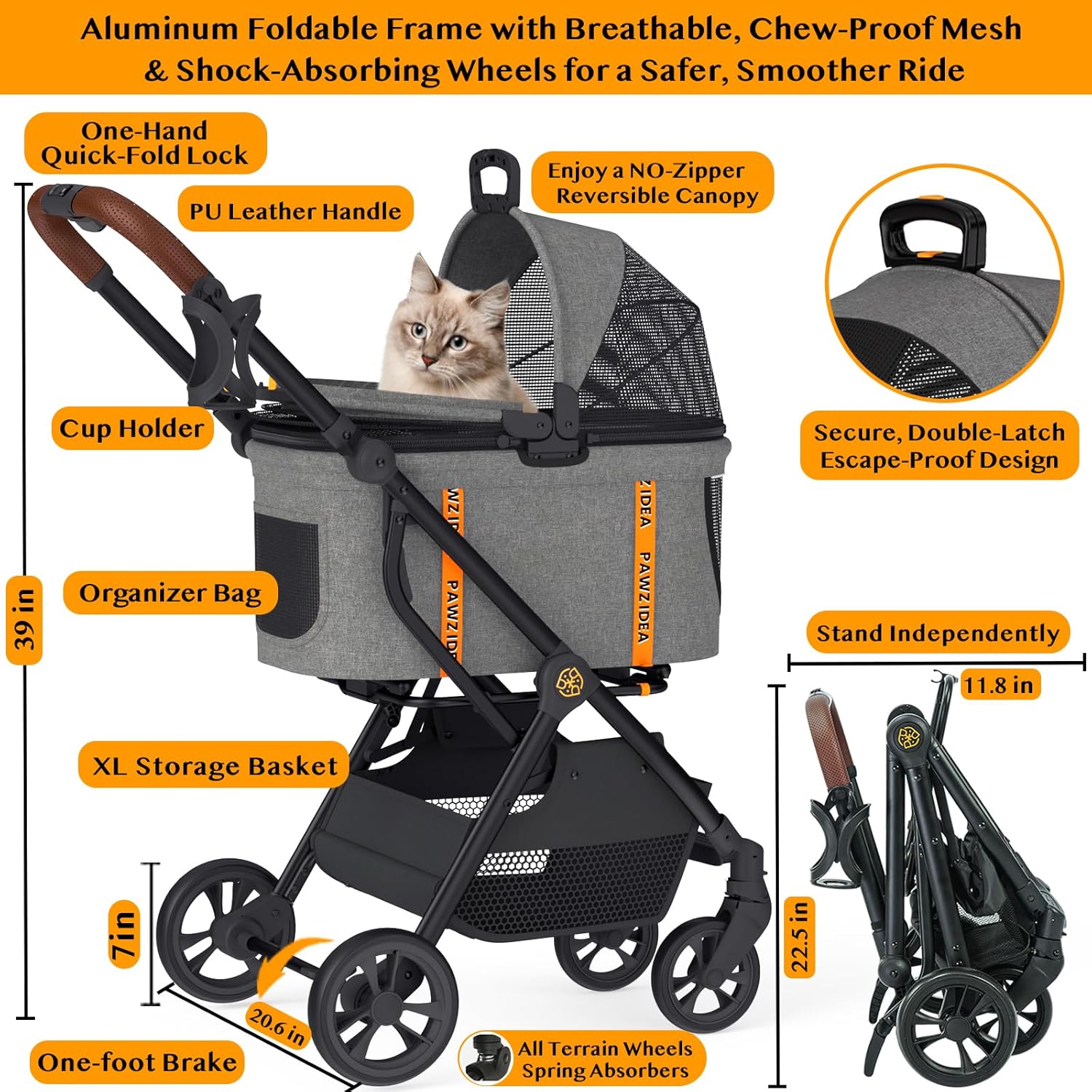 PAWZIDEA Pet Stroller 4 in 1, Dog Strollers for Small/Medium Dogs with Detachable Carrier Easy Lock Canopy, Seatbelt Puppy Car Seat, Cozy House, Foldable & Lightweight Jogger Cat Stroller, 4 Wheels